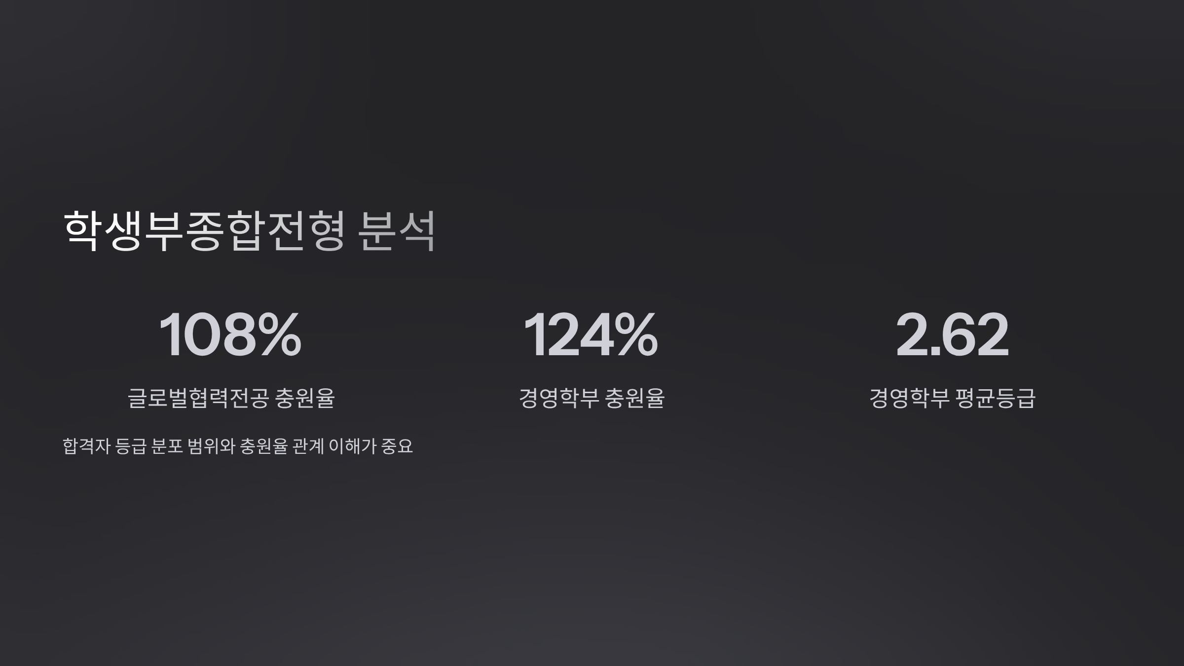 학생부종합전형에서 발표되는 합격자 평균 등급은 참고 자료일 뿐, 절대적인 기준이 아닙니다. 중요한 것은 합격자들의 교과 성적 분포 범위와 충원율의 관계를 이해하는 것입니다. 특정 학과의 합격자 평균 등급이 3.0이라도, 실제 합격자들은 2등급 중반부터 4등급 초반까지 넓게 분포할 수 있습니다. 여기에 높은 충원율이 더해지면 예비 번호 후순위 학생에게도 합격의 기회가 돌아갈 수 있습니다.