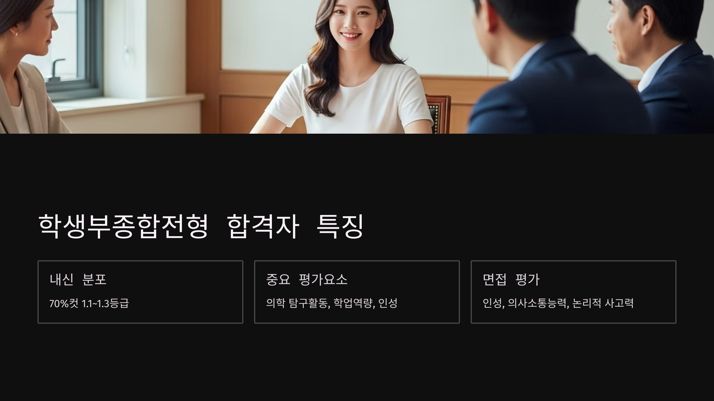 - 인성: 봉사활동, 리더십 활동 등을 통해 예비 의료인으로서 갖추어야 할 공동체 의식과 나눔의 정신을 보여주어야 합니다.