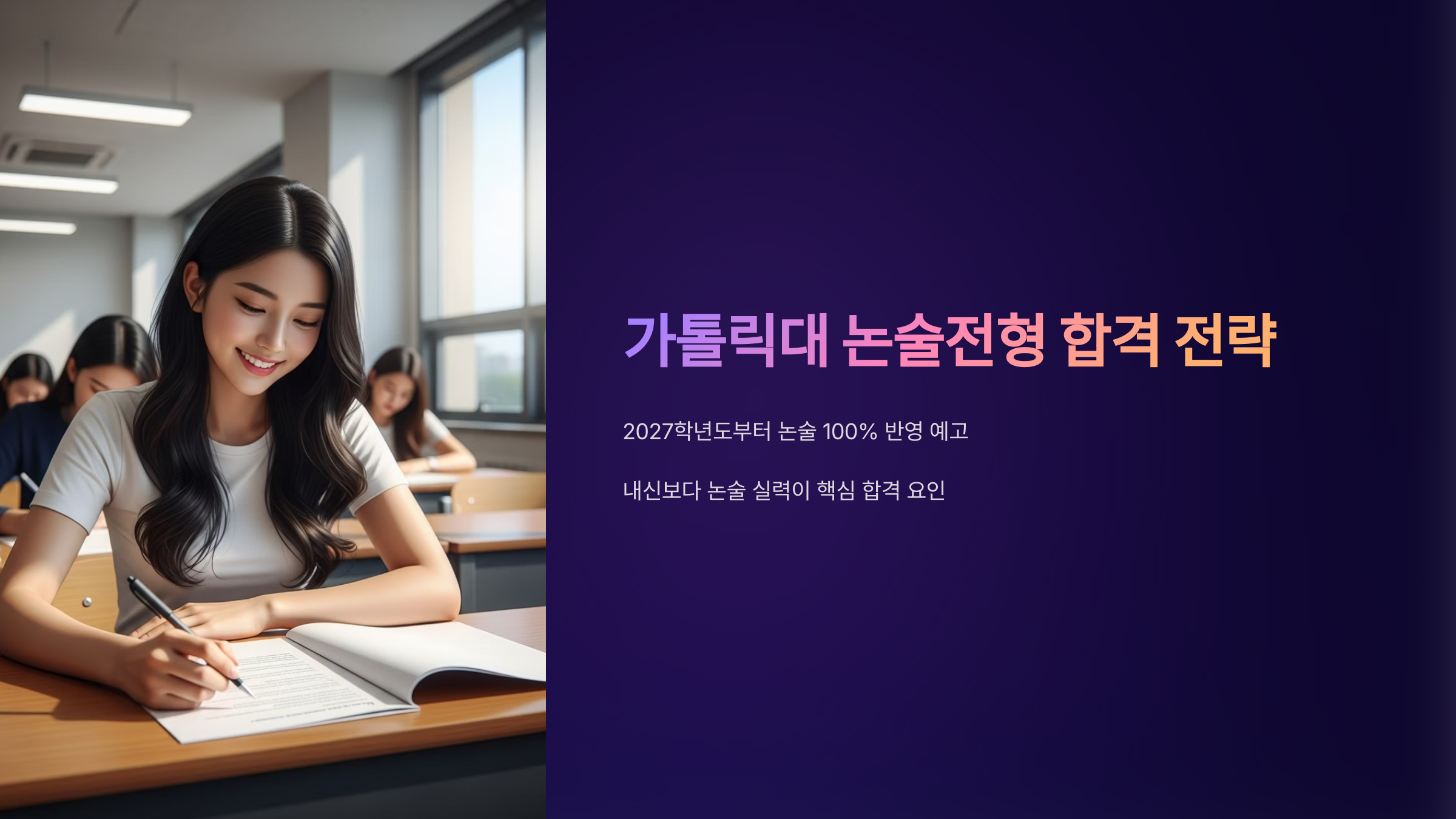 논술전형은 내신 성적이 다소 불리한 학생들에게 역전의 기회를 제공하는 전형입니다. 특히 가톨릭대 수시 등급컷의 반영 비율이 낮고(20%), 2027학년도부터는 논술 100%로 변경될 예정이므로 논술 실력의 중요성이 절대적입니다. 의예과, 약학과, 간호학과를 제외하고는 수능 최저학력기준이 없다는 점도 지원자가 몰리는 요인입니다.