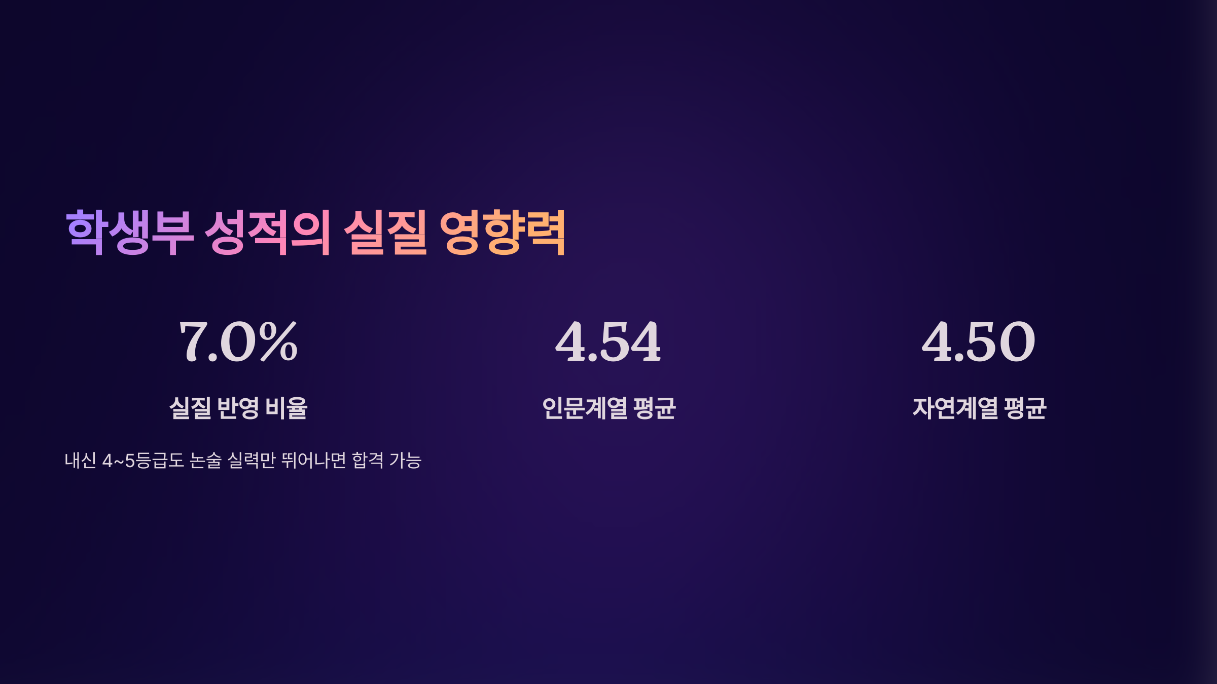 수험생들이 가장 궁금해하는 부분 중 하나는 논술전형에서 학생부 교과 성적이 실제로 얼마나 영향을 미치는지일 것입니다. 2025학년도까지는 논술 80%, 교과 20%의 비율로 반영되었지만, 그 실질적인 영향력은 매우 미미했습니다. 가톨릭대학교가 발표한 자료에 따르면, 학생부 교과 성적의 실질 반영 비율은 7.0%에 불과했습니다. 이는 내신 1등급과 5등급 학생의 점수 차이가 크지 않다는 것을 의미합니다.