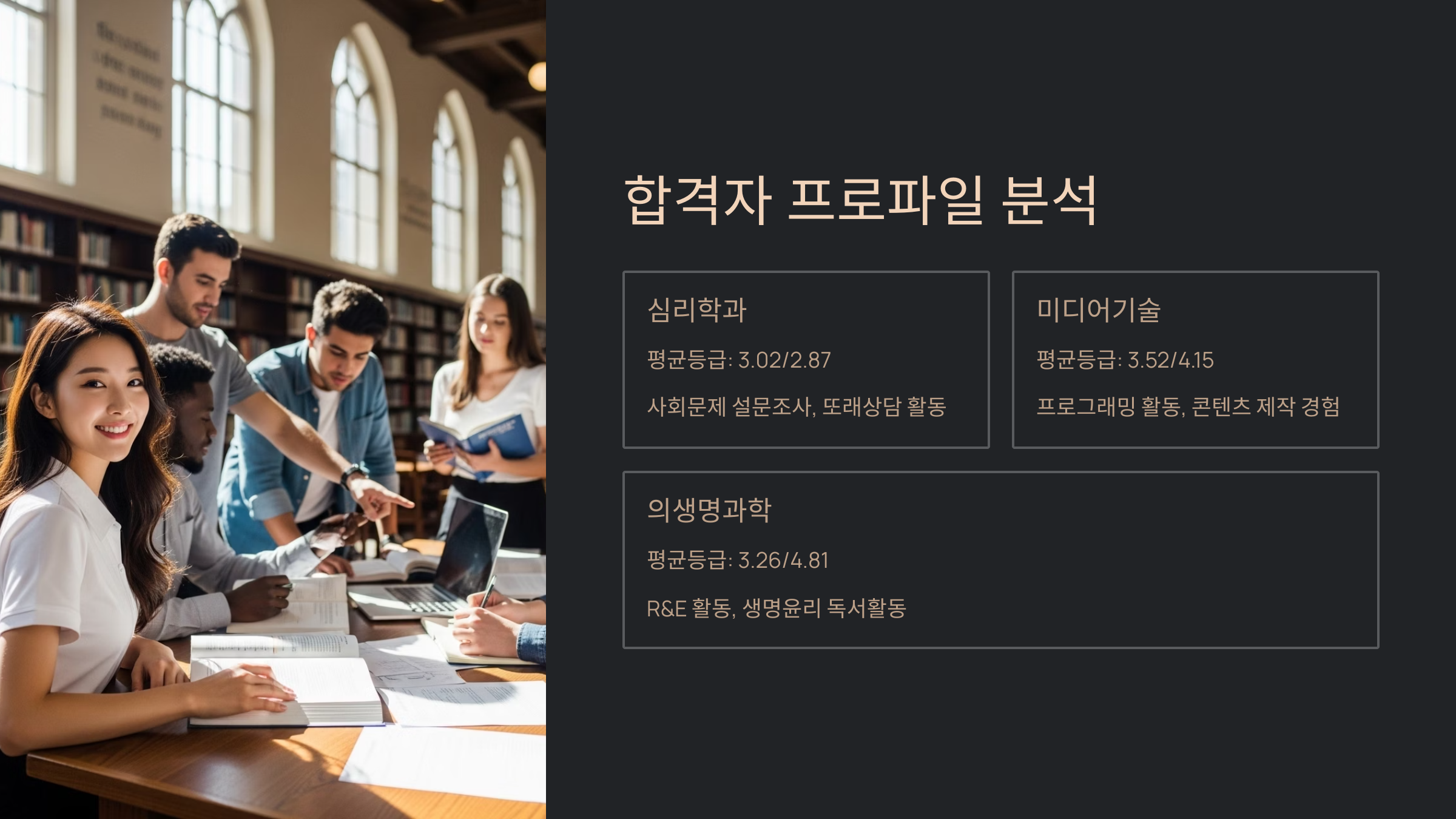 단순한 숫자로서의 가톨릭대 수시 등급컷을 넘어, 실제 합격자들의 학교생활기록부는 어떤 특징을 가지고 있었을까요? 최근 입시 결과를 바탕으로 주요 학과 합격자들의 프로파일을 분석해 보면, 성공적인 학종 준비를 위한 구체적인 방향을 설정할 수 있습니다.