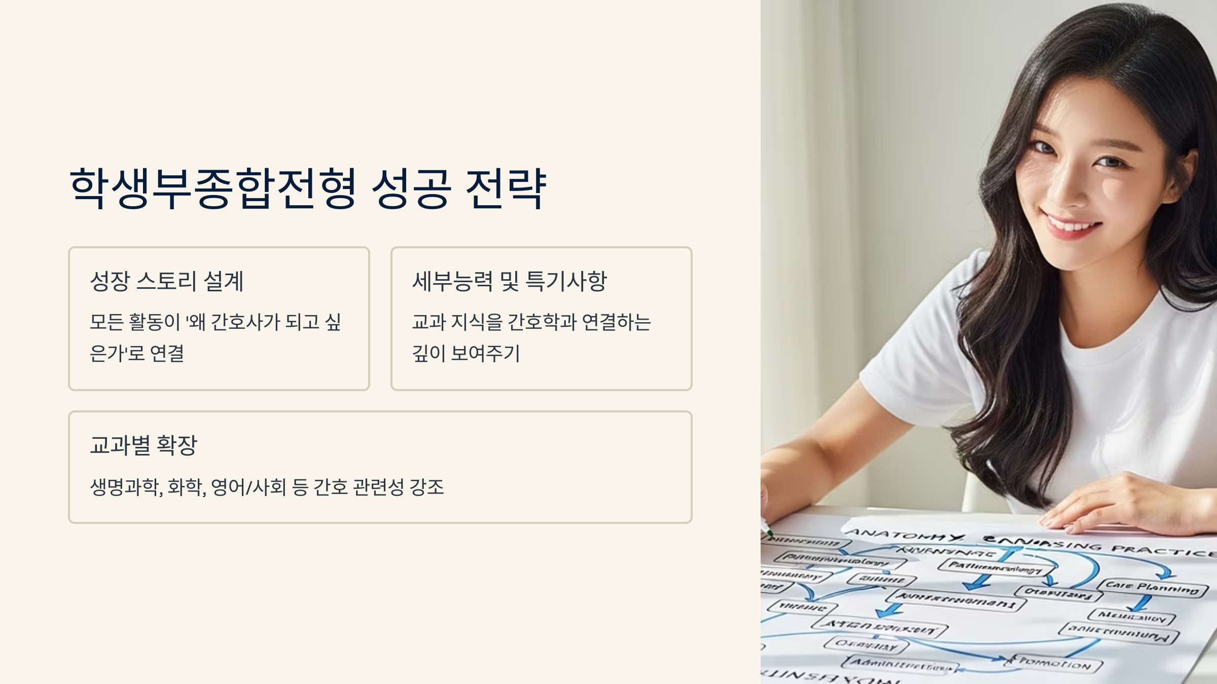 내신 3등급대 학생이 학생부종합전형으로 간호학과에 합격하기 위해서는, 단순히 활동을 나열하는 것을 넘어 자신만의 '성장 스토리'를 학생부에 치밀하게 설계해야 합니다. 입학사정관은 수치화된 등급 뒤에 숨겨진 학생의 잠재력과 전공에 대한 진정성을 보고자 합니다. 따라서 모든 활동이 '왜 간호사가 되고 싶은가?'라는 핵심 질문에 대한 답으로 귀결되도록 유기적으로 연결하는 것이 관건입니다.