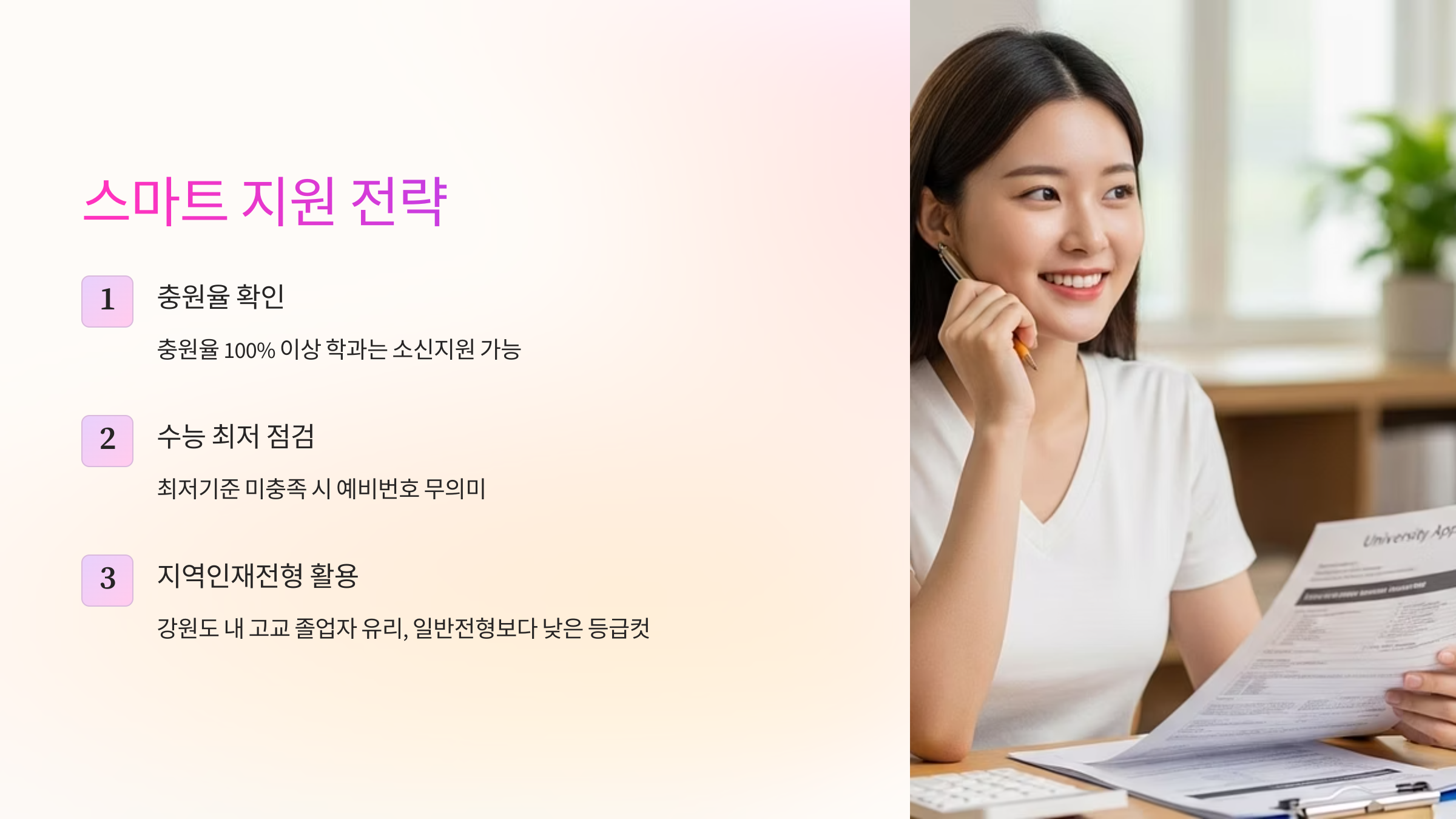 - 전략 3: 지역인재전형은 일반전형보다 수능 최저 기준이 1등급가량 낮으므로, 강원도 소재 고교 학생이라면 적극적으로 활용하는 것이 유리합니다.
