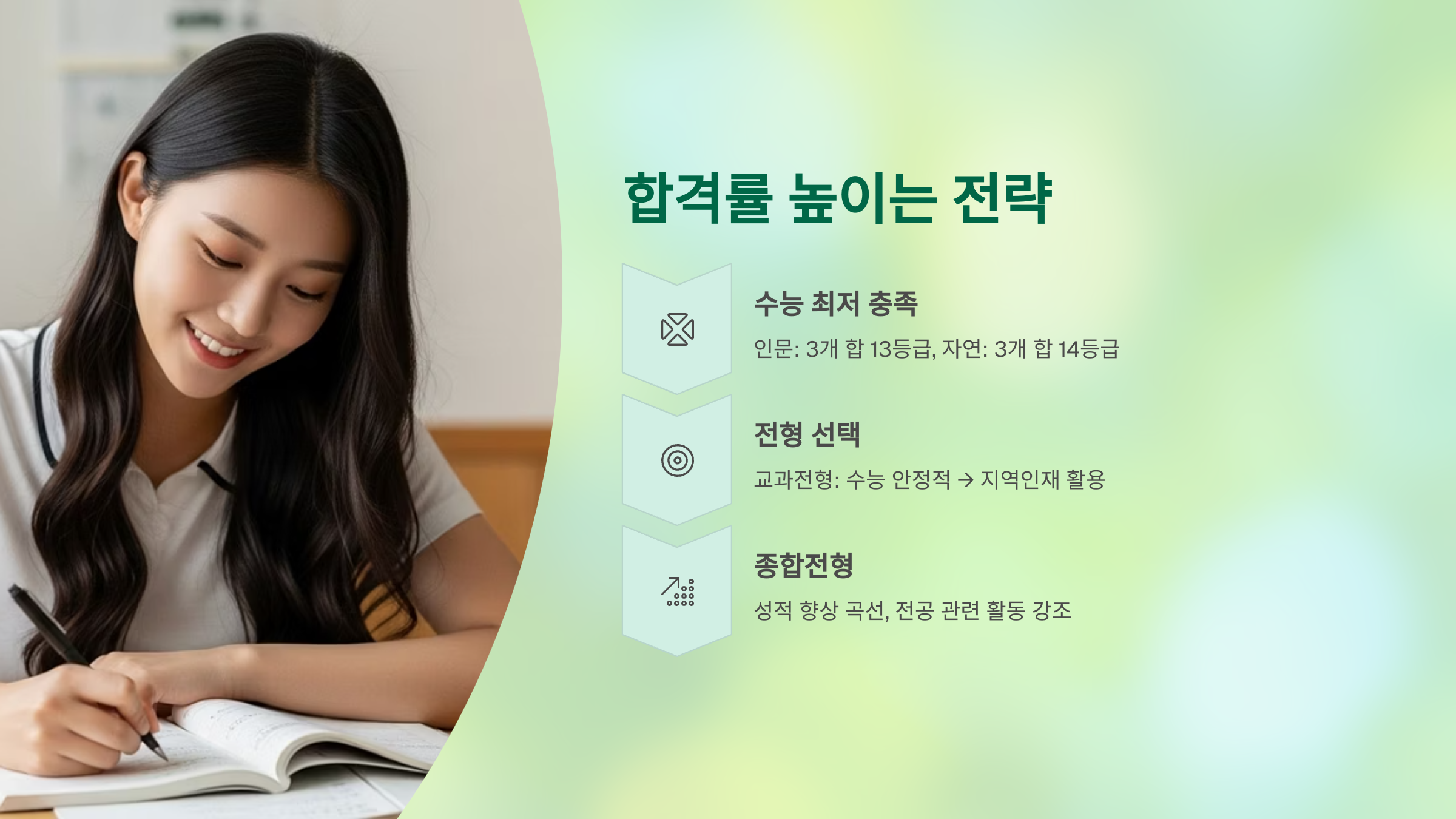 앞서 강조했듯이, 4등급대 학생이 교과전형으로 강원대에 합격하기 위한 가장 확실한 방법은 수능 최저학력기준을 안정적으로 충족하는 것입니다. 수능 최저 기준은 높은 성적대의 학생들을 걸러내는 필터 역할을 하므로, 이를 통과하는 것만으로도 실질적인 경쟁률은 크게 낮아집니다.