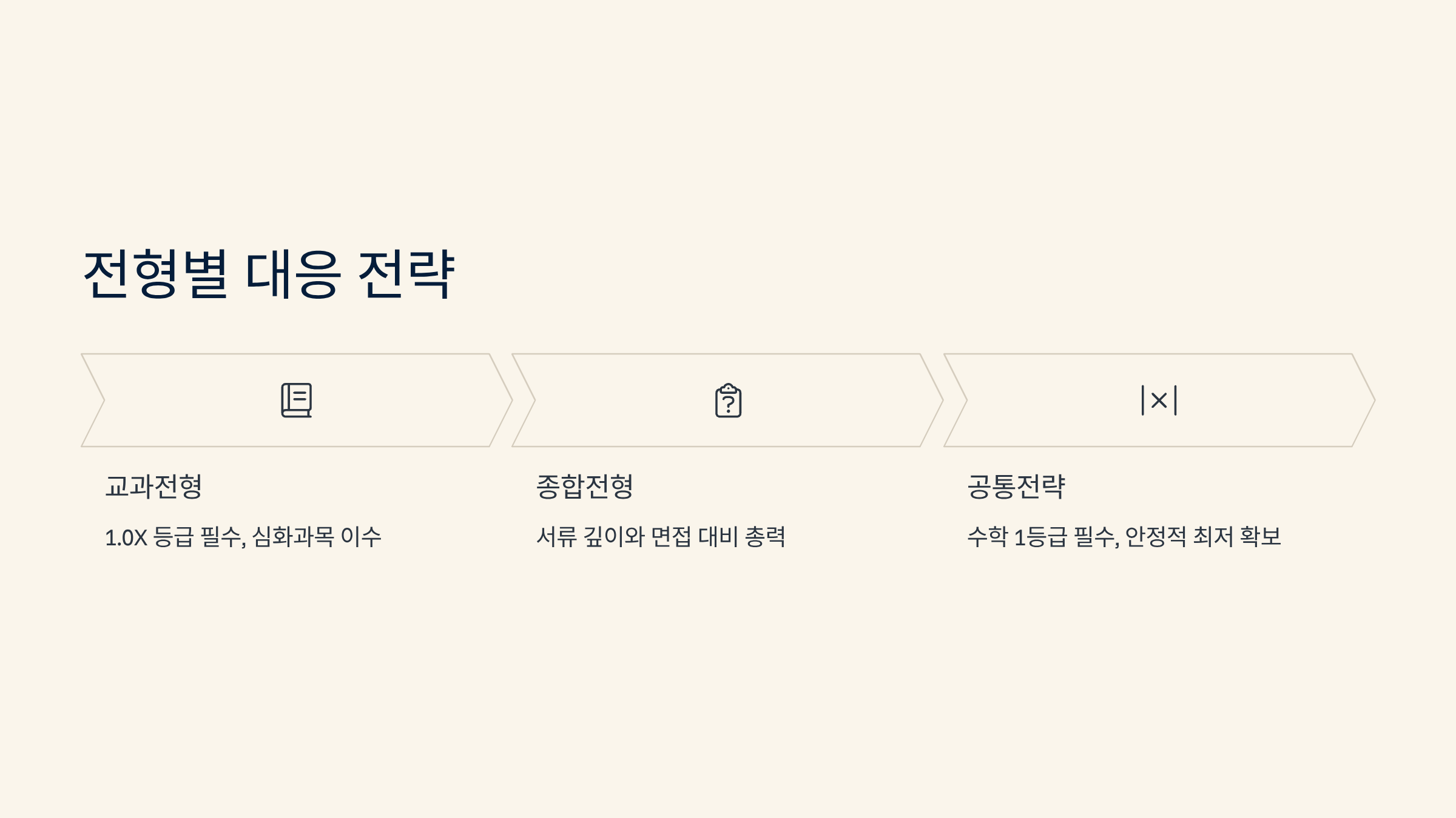 | 주요 변수 | 교과 성적 환산 점수, 수능 최저 충족 | 서류평가(학생부 내용), 심층 면접 | 수능 최저에 자신 없다면 종합전형은 피해야 함 |