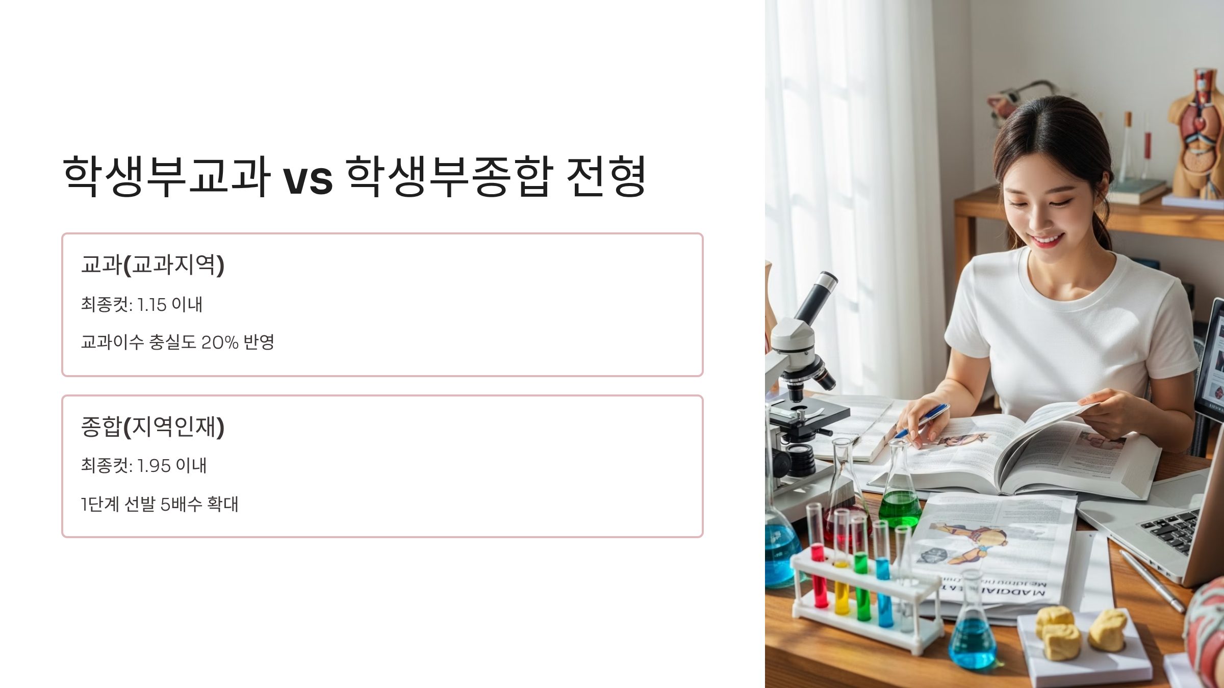 학생부교과전형은 오로지 정량적인 교과 성적으로 평가하므로, 합격선이 매우 촘촘하게 형성됩니다. 반면, 학생부종합전형은 정성평가가 포함되므로 합격자의 성적 스펙트럼이 비교적 넓게 나타납니다. 자신의 내신 등급이 1.1등급 이내의 최상위권이라면 학생부교과전형이 유리하며, 1.5등급 내외이면서 의학 관련 탐구 활동이 풍부하다면 학생부종합전형이 더 나은 선택이 될 수 있습니다. 아래 표는 두 전형의 주요 지표를 비교한 것으로, 자신의 상황에 맞는 전형을 선택하는 데 참고하시기 바랍니다.