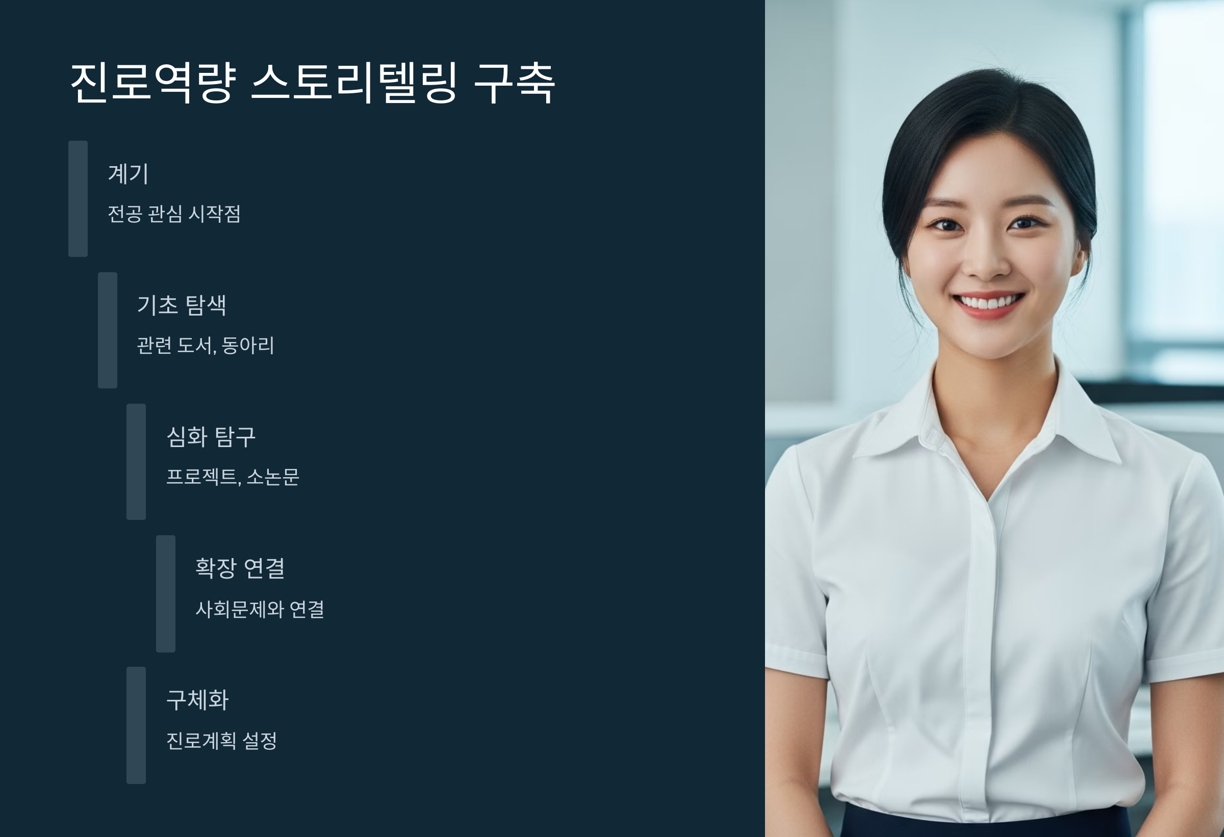 - 5단계 (구체화): 대학 진학 후의 학업 계획과 졸업 후의 진로 계획을 구체적으로 설정하여, 전공에 대한 진정성과 뚜렷한 목표 의식을 보여줍니다.