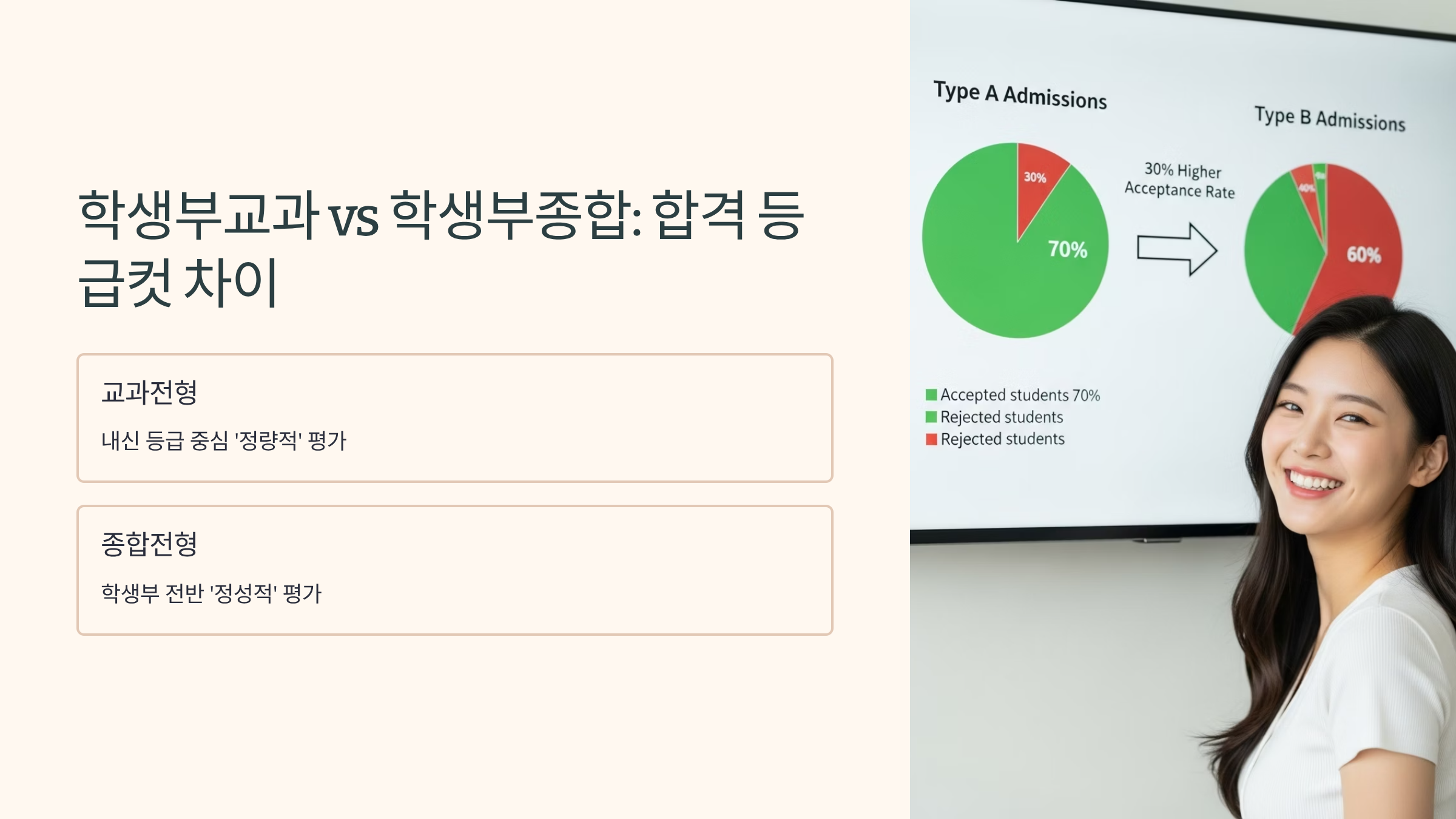 계명대학교 수시모집의 양대 축인 학생부교과전형과 학생부종합전형은 성적을 평가하는 방식이 근본적으로 다릅니다. 따라서 동일 학과라도 전형에 따라 합격 등급컷에 차이가 발생하며, 이는 수험생에게 유불리로 작용할 수 있습니다. 자신의 학생부 특성을 정확히 파악하고, 전형별 등급컷 차이를 분석하여 지원 전략을 수립하는 것이 매우 중요합니다.