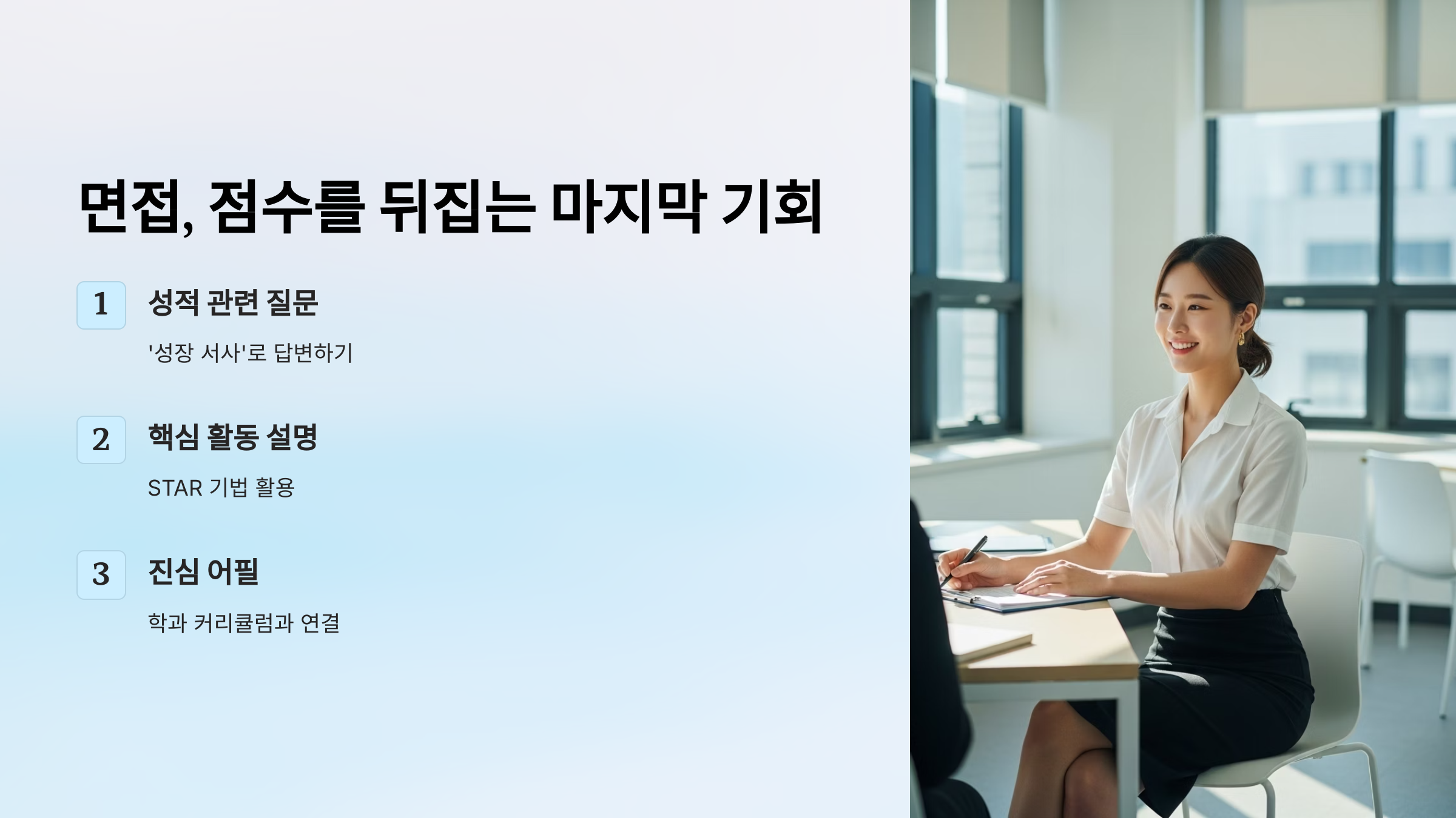3점대 성적표의 약점을 만회할 최종 무기는 바로 '깊이 있는 비교과'와 '논리적인 면접'입니다. 학생부에 기록된 활동 하나하나가 의미를 가져야 하며, 면접에서는 서류의 내용을 바탕으로 자신의 잠재력을 확실하게 각인시켜야 합니다.