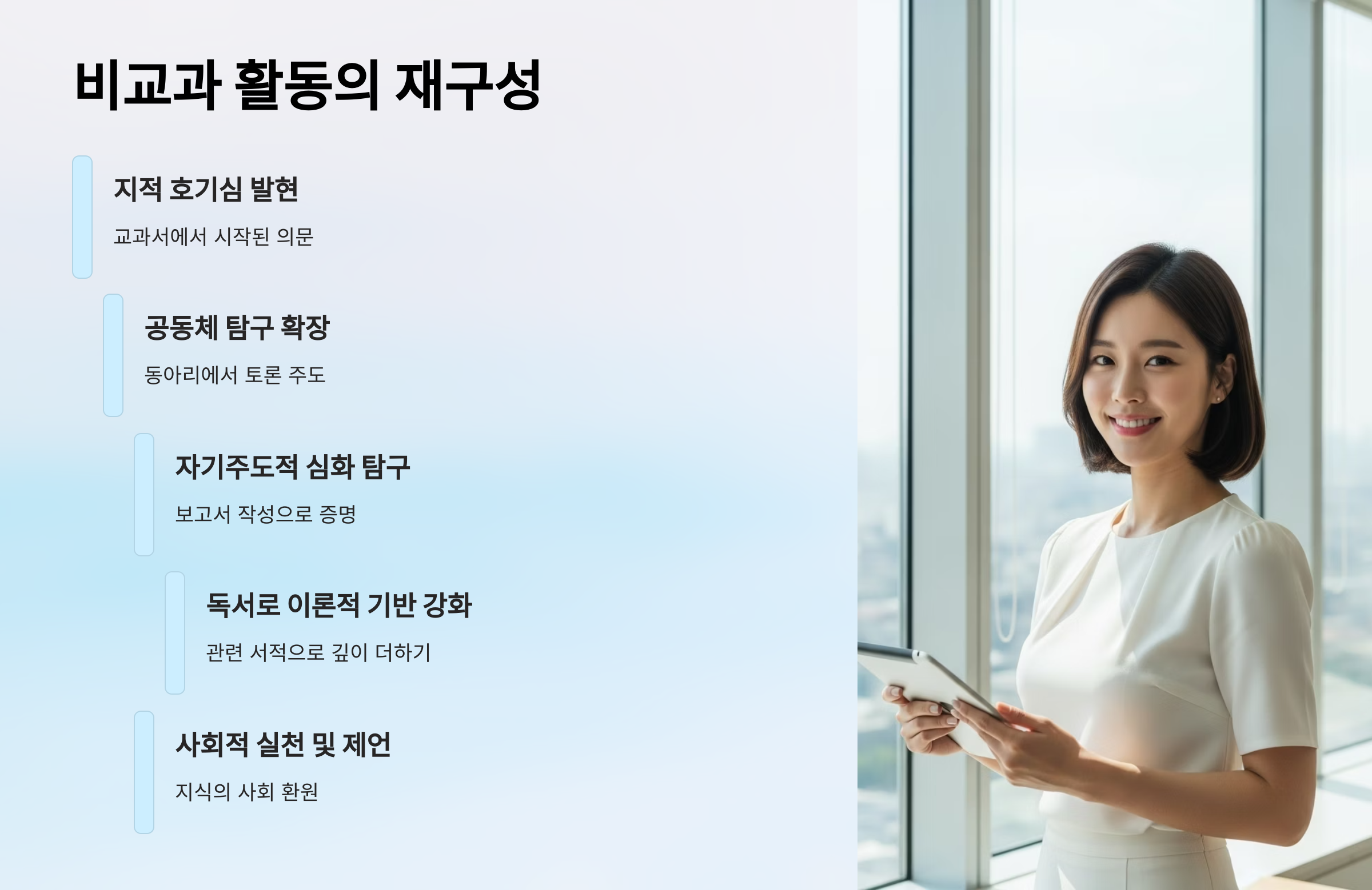 - 2단계 (공동체 탐구로의 확장): 교내 시사토론 동아리에서 '디지털 격차 해소 방안'을 주제로 토론을 주도합니다. 친구들과 자료를 조사하고, 다양한 의견을 나누며 문제의식을 구체화하고 해결 방안을 모색하는 과정이 학생부에 기록됩니다.
