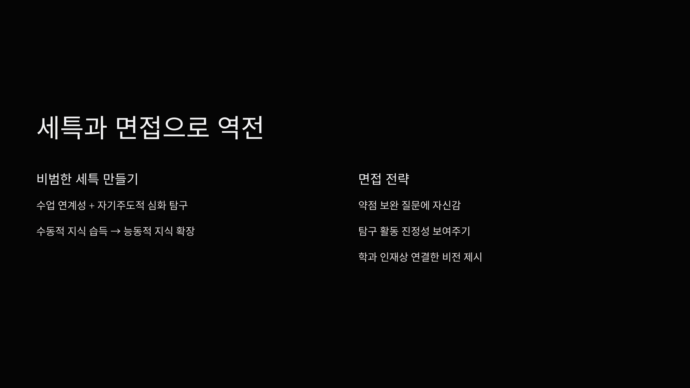 | 평가 결과 | 단순 성실성 어필 | 전공 적합성, 자기주도성, 발전 가능성 동시 증명 |
