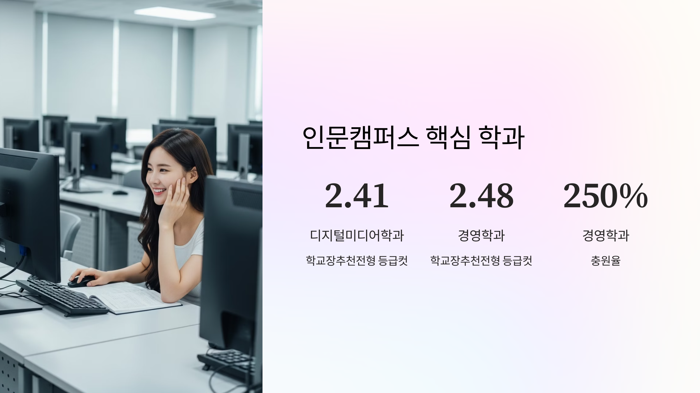 명지대학교 서울 인문캠퍼스는 전통적으로 수험생들의 선호도가 높은 학과들이 밀집해 있어 치열한 경쟁을 보입니다. 특히 디지털미디어학과와 경영학과는 명지대의 간판 학과로서, 이 두 학과의 입시결과 변동 추이를 분석하면 인문계열 전체의 흐름을 파악할 수 있습니다.
