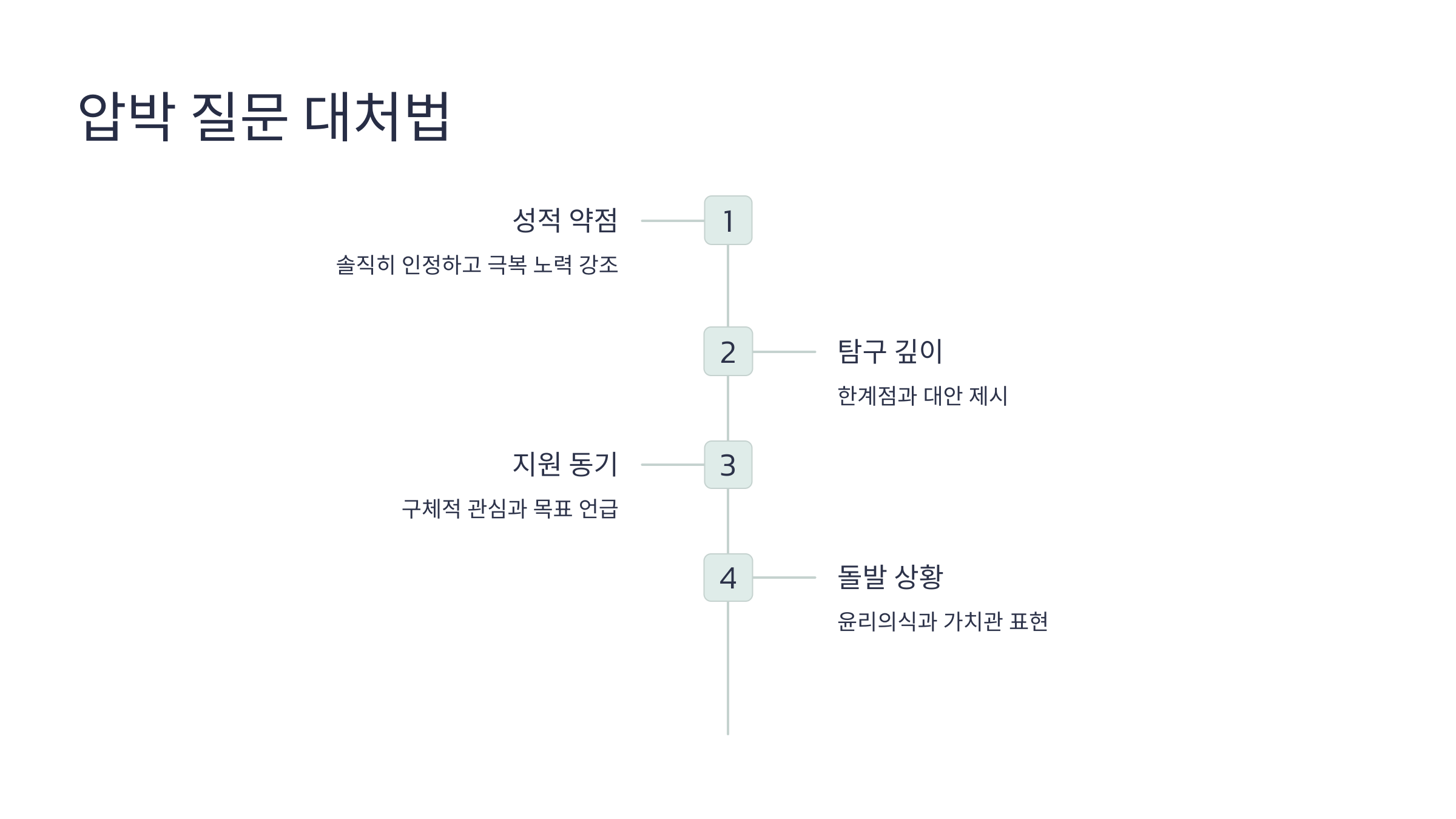 면접의 변별력은 기본적인 질문이 아닌, 지원자를 압박하는 질문과 한 가지 주제를 깊이 파고드는 '꼬리 질문'에서 발생합니다. 특히 성적이 아쉬운 학생에게는 약점을 파고드는 질문이 들어올 확률이 높습니다. 이때 어떻게 답변하느냐가 합격과 불합격을 가르는 결정적 순간이 됩니다.
