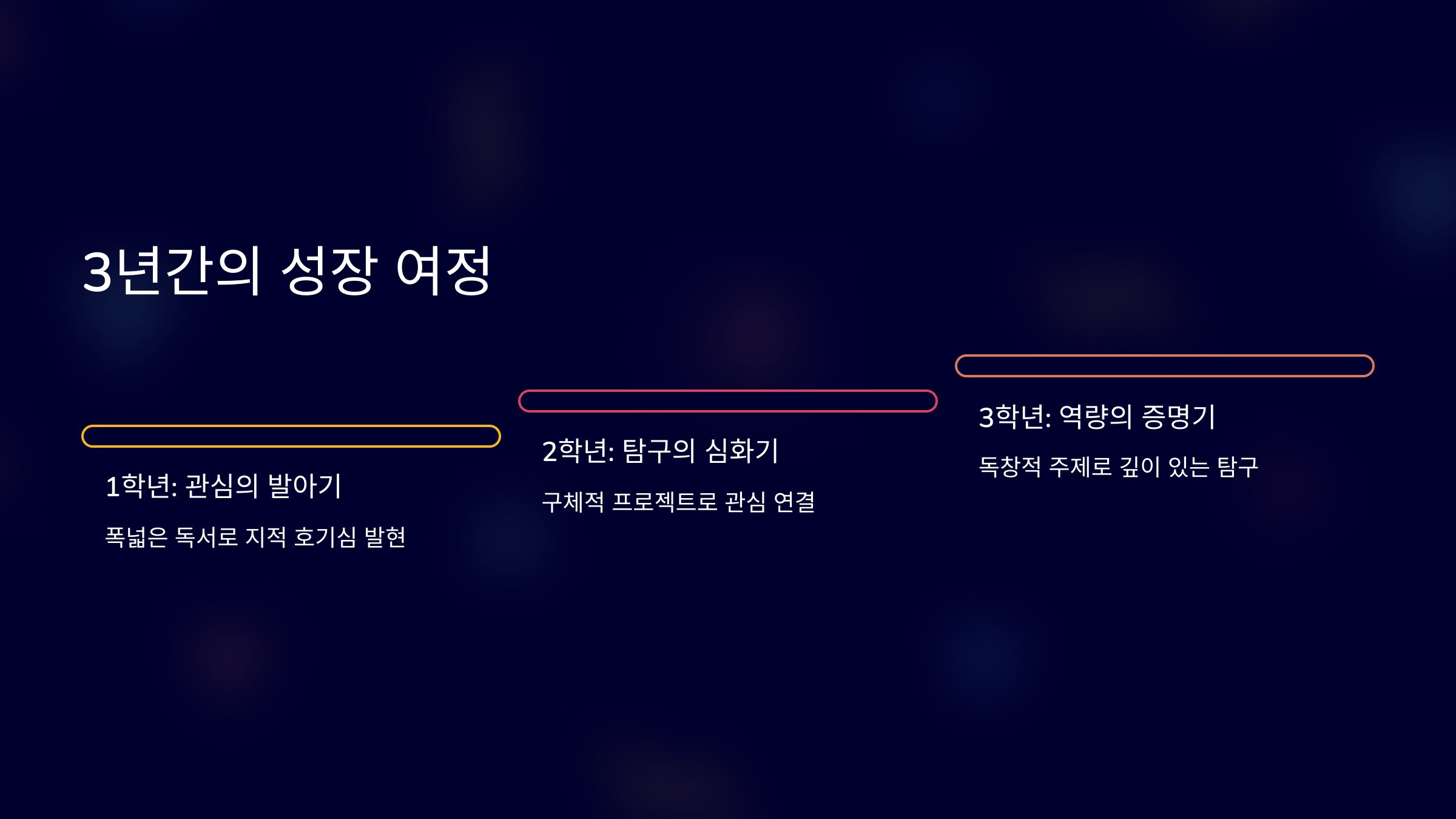 | 3단계 | 탐구의 유기적 심화 | 1학년: 뇌과학 책 읽기 / 2학년: 아두이노 키트 조립 / 3학년: AI 기술 조사 | 1학년: 치매 관련 독서 → 2학년: 치매 환자 위치 추적을 위한 아두이노 기반 GPS 장치 프로토타입 제작 → 3학년: GPS 데이터 분석을 통한 이상 행동 패턴 감지 AI 알고리즘 원리 탐구 | 단발성 흥미 vs 지식이 경험으로, 경험이 심화 탐구로 발전하는 과정이 명확함 |