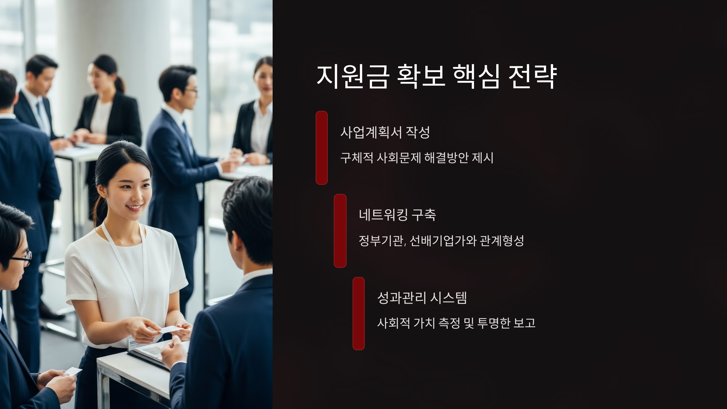 정부 지원 사업은 경쟁률이 높고, 정보 접근성이 제한적일 수 있습니다. 네트워킹은 이러한 정보의 비대칭성을 해소하고, 지원 가능성을 높이는 데 결정적인 역할을 합니다. 관련 기관 담당자, 이미 성공한 사회적 기업가, 액셀러레이터 등 다양한 이해관계자와의 관계 구축은 사업 계획 수립, 서류 준비, 면접 과정 전반에 걸쳐 실질적인 도움을 제공합니다.