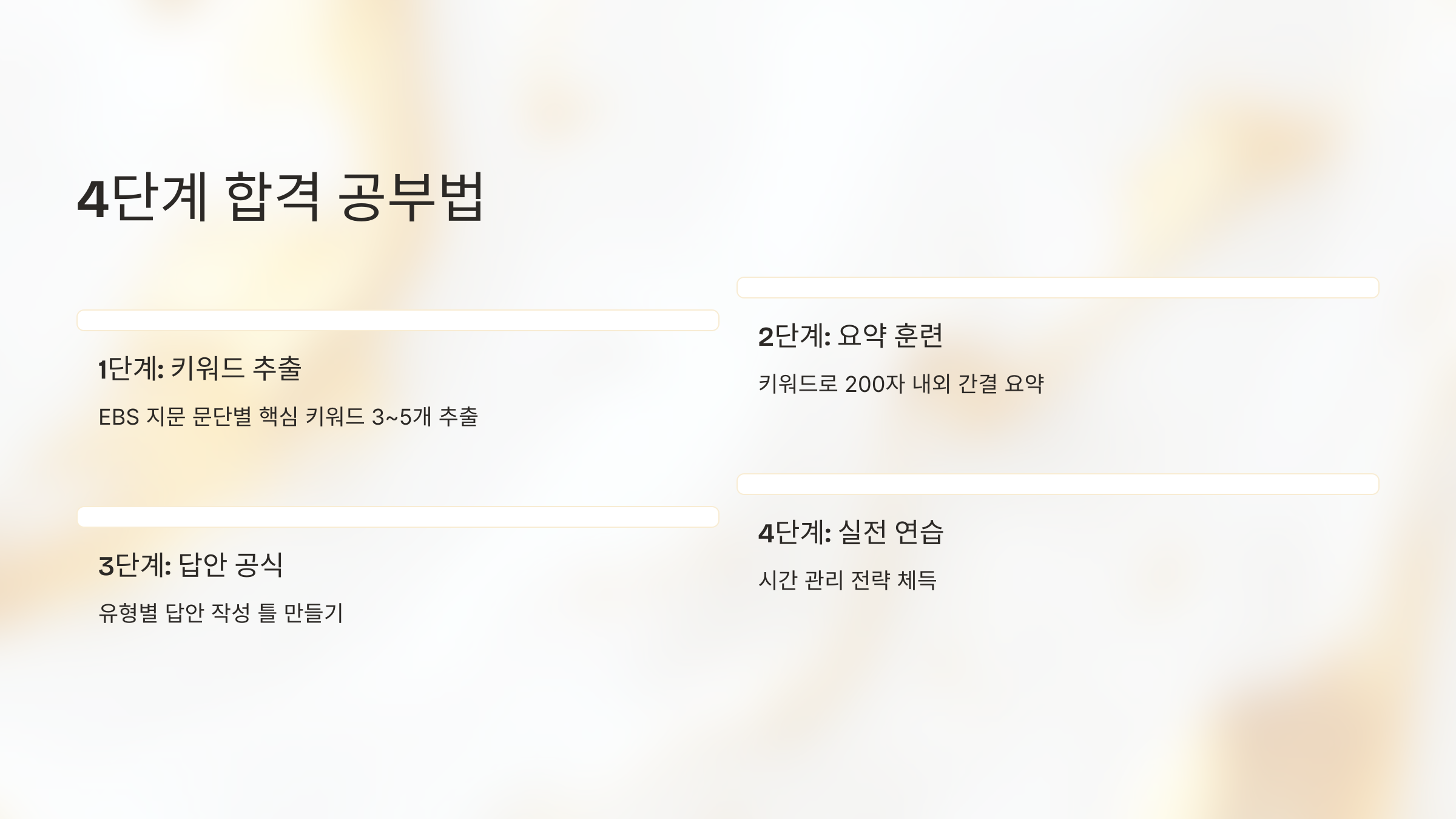 이 4단계 학습법은 단순히 눈으로 읽는 공부가 아니라, 손으로 직접 키워드를 뽑고, 문장을 만들고, 시간을 재며 답안을 구성하는 실전적인 훈련입니다. 이 과정을 꾸준히 반복한다면 논술에 대한 막연한 두려움은 자신감으로 바뀔 것입니다.