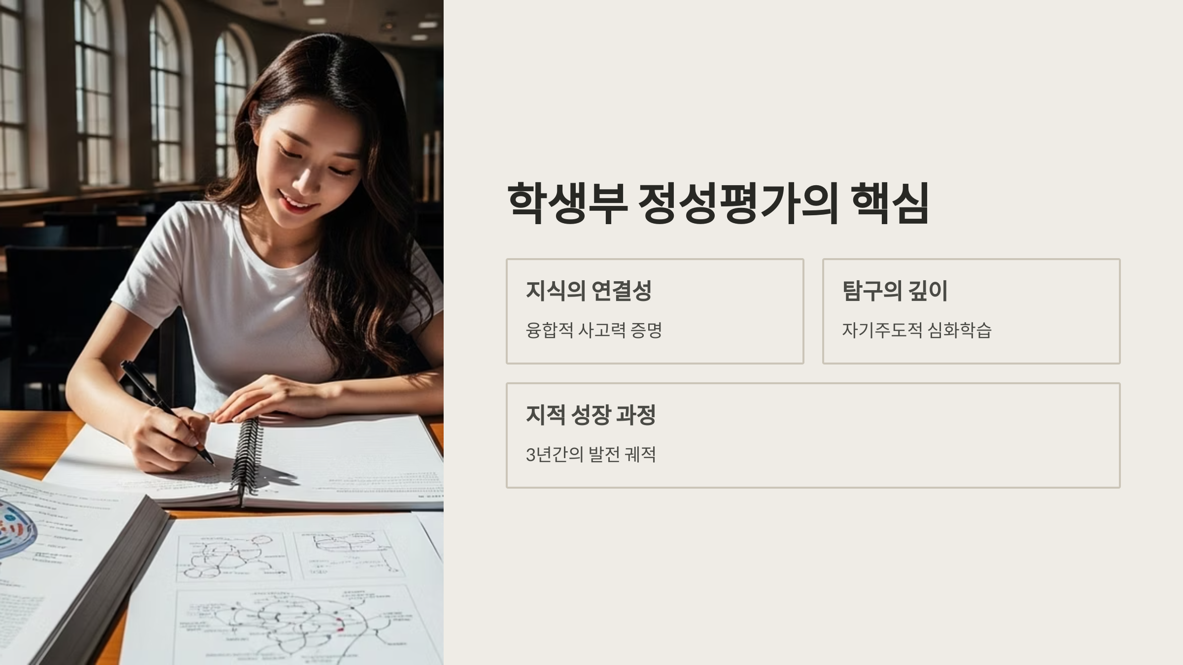 단순히 '생명과학Ⅱ 수업에서 유전자 발현 조절에 대해 배우고 우수한 성적을 거둠'이라는 기록과, '유전자 발현 조절 원리 학습 후, 후성유전학적 조절 기작인 히스톤 변형에 대한 심층 탐구를 진행하고, 관련 논문을 탐독하여 약물 타겟으로서의 가능성을 분석한 보고서를 작성함'이라는 기록은 질적으로 완전히 다릅니다. 후자와 같이 자기주도적 학습 과정의 구체성과 지식의 심화 과정이 드러나는 것이 정성평가의 핵심입니다. 이러한 기록들은 지원자의 서울대 의대 수시 등급을 보완하고도 남을 강력한 무기가 됩니다.