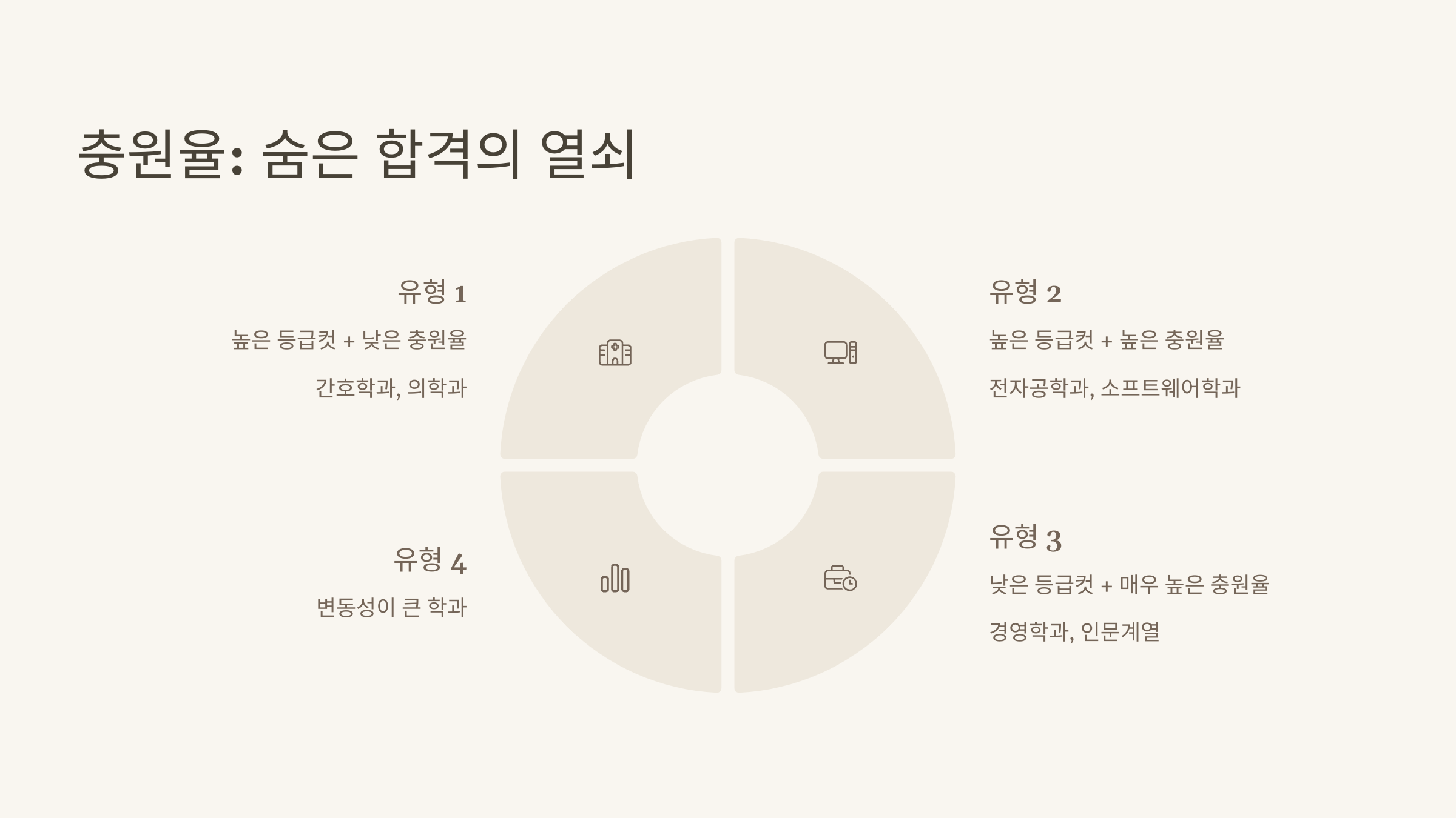 - 유형 4: 등급컷과 충원율의 변동성이 큰 학과모집인원 변화, 전형 방식 변경 등의 영향을 많이 받는 학과입니다. 과거 데이터의 신뢰도가 상대적으로 떨어지므로, 올해의 경쟁률 변화와 입시 환경 변수를 더욱 면밀히 살펴야 합니다. 위험성이 따르지만, 정보 분석을 통해 '기회의 땅'이 될 수도 있습니다.