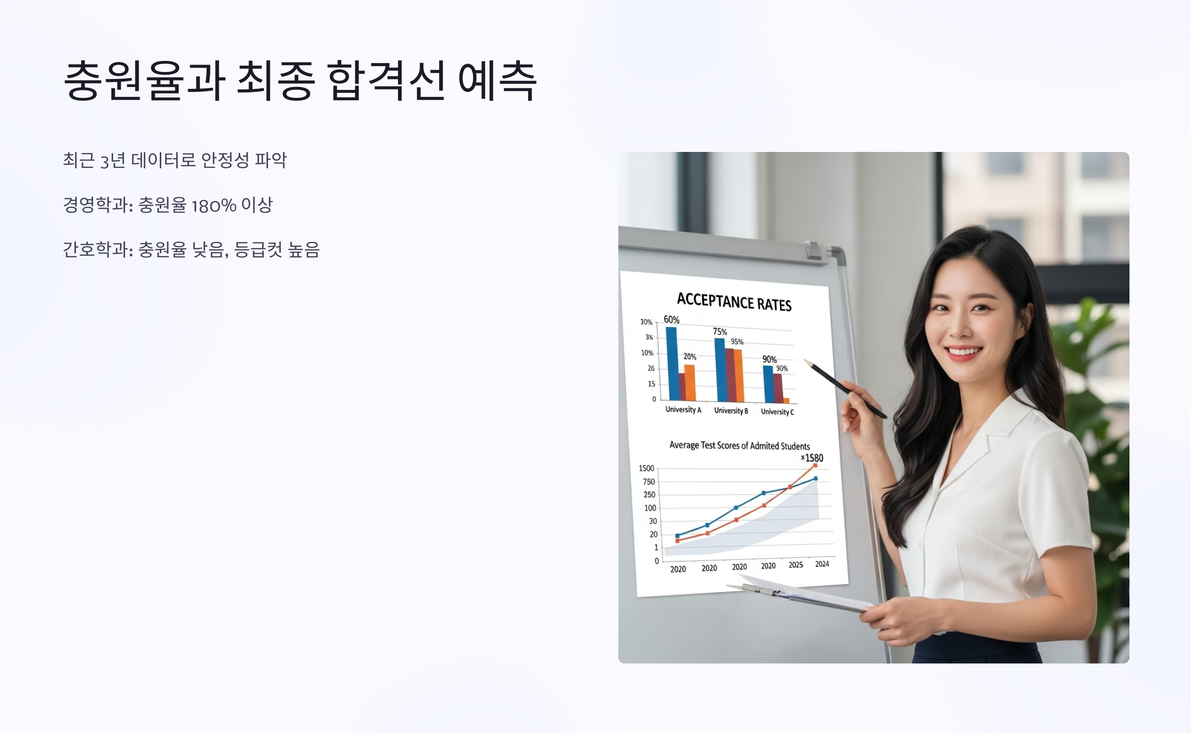 - 유형 1: 높은 등급컷 + 낮은 충원율 (예: 간호학과, 의학과)합격선이 매우 높고 합격생들의 이탈이 거의 없는 학과입니다. 지원자들의 충성도가 절대적이므로, 추가 합격에 대한 기대보다는 최초 합격을 목표로 해야 합니다. 지원자의 교과 성적, 비교과 활동 모두 최상위 수준이어야 하며, 안정 지원보다는 소신·상향 지원의 성격이 강합니다.