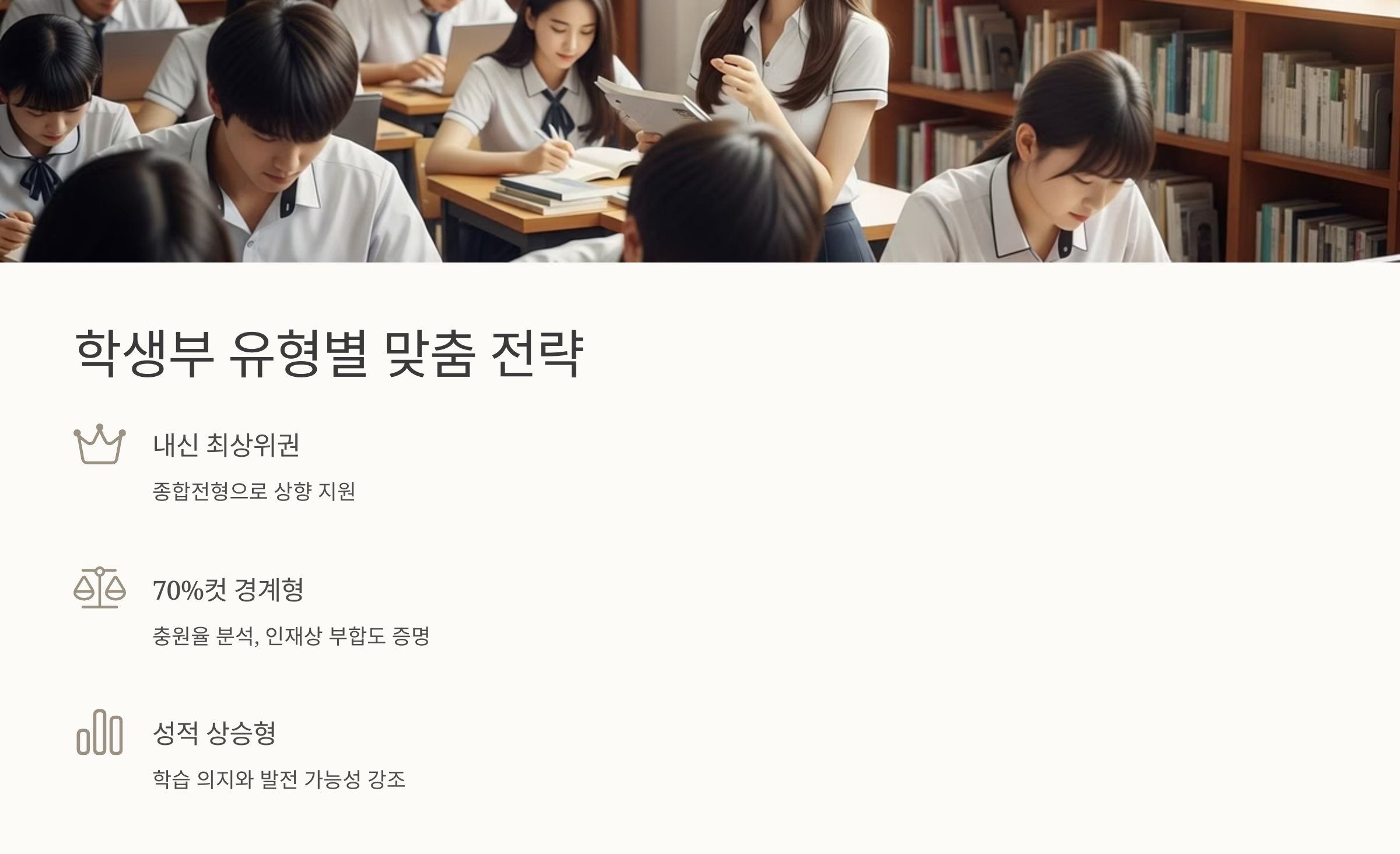 - 내신 최상위권 학생: 학생부교과(고교추천전형)를 안정적으로 지원.