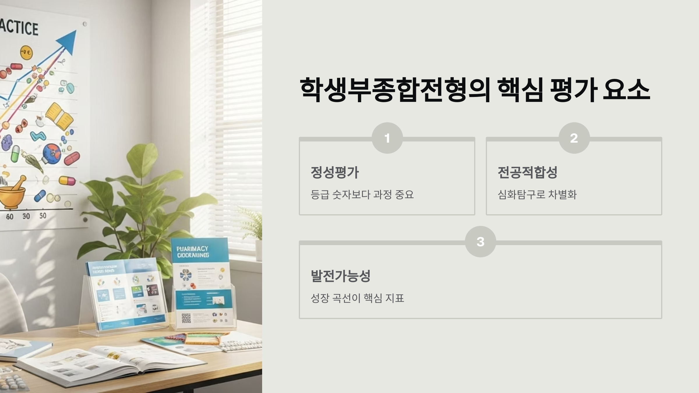 학생부종합전형은 1점대 중후반에서 2점대 초반의 내신으로도 약대 합격을 노려볼 수 있는 전형입니다. 교과전형과 달리 내신 등급을 정량적으로만 평가하지 않고, 학생부에 기록된 활동의 깊이와 전공 관련 우수성을 종합적으로 평가하기 때문입니다. 특히 2024학년도부터 자기소개서가 폐지되면서, 학교생활기록부, 그 중에서도 세부능력 및 특기사항(세특)의 기록이 합격의 결정적인 열쇠가 되었습니다.