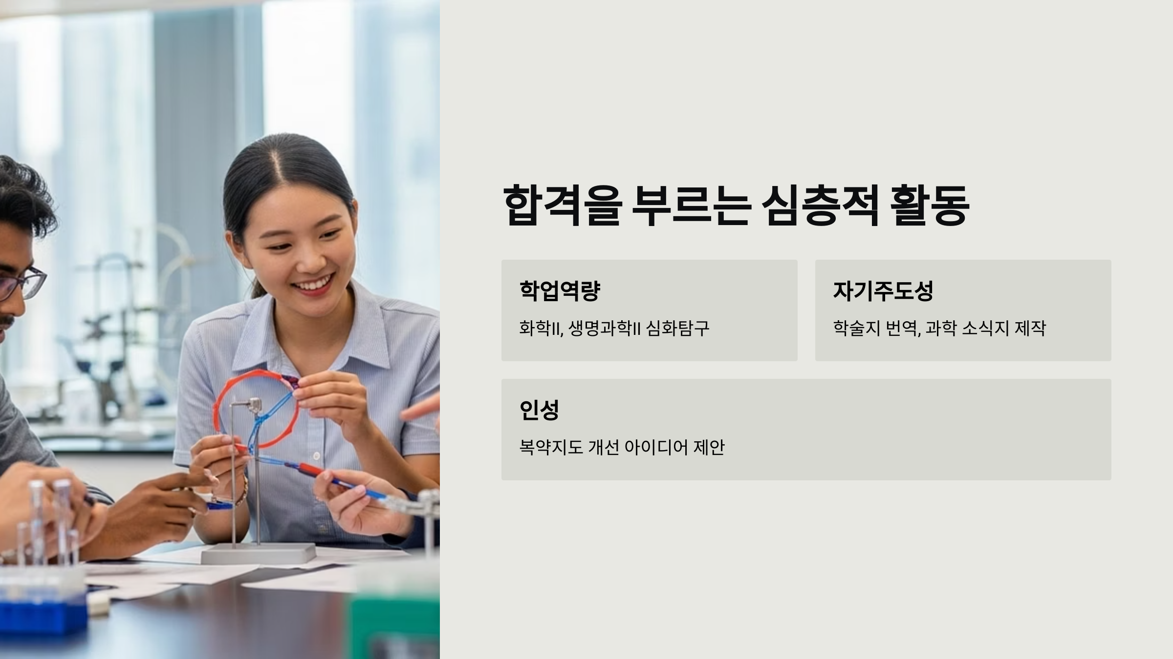 | 전공 적합성 | 과학 실험 동아리 활동 | 동아리 내에서 '천연물 신약 후보물질 탐색' 프로젝트 팀을 기획하고 주도적으로 실험을 설계 및 수행. |