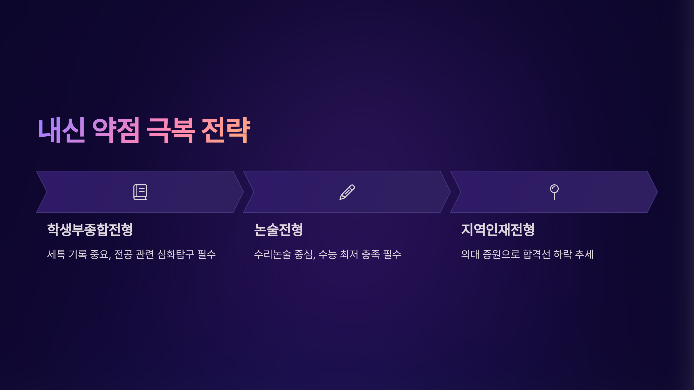 | 준비 전략 | 목표 대학 기출문제 중심의 논술 대비 + 수능 고득점 전략 | 철저한 내신 관리 + 해당 지역 일반전형과 비교하여 유불리 분석 |