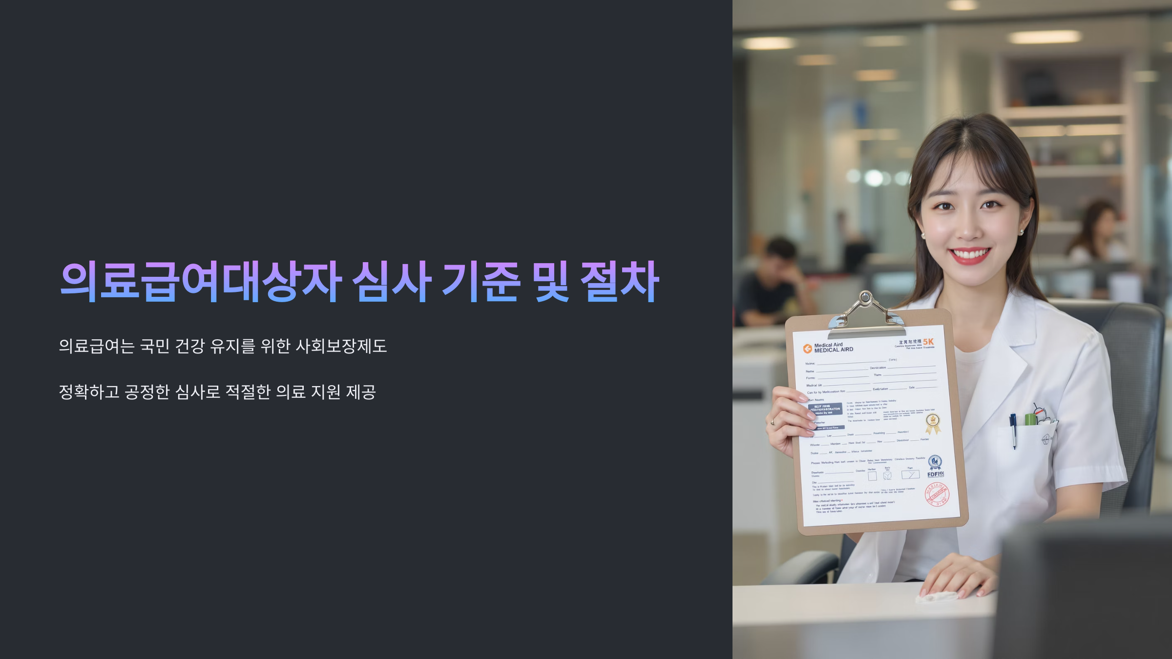 정확하고 공정한 심사를 통해, 필요한 사람들에게 적절한 의료 지원이 이루어질 수 있도록 하는 것이 목표입니다.
