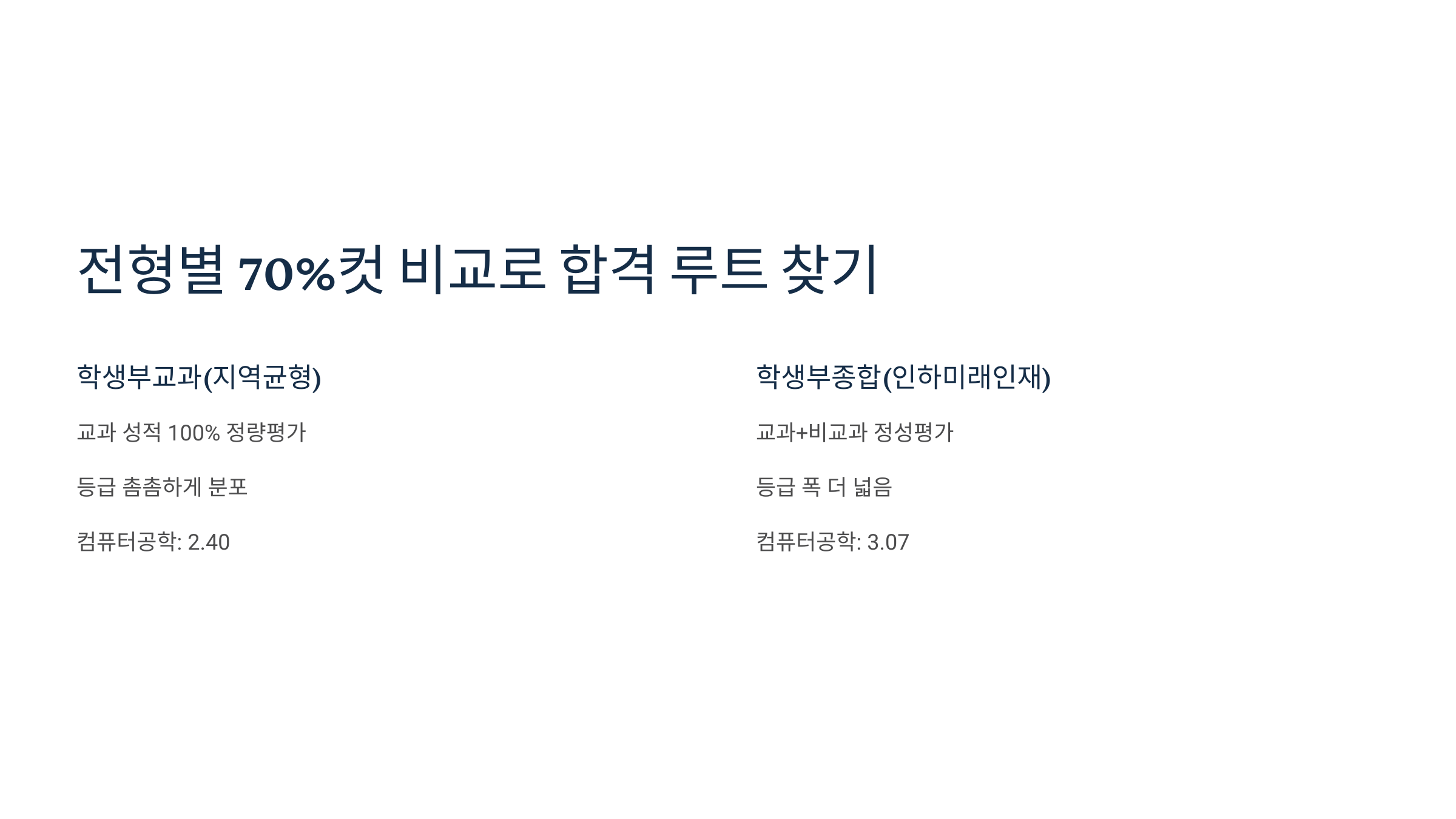 예를 들어, 학생부교과 전형의 70%컷이 2.8등급이라면 내신 3.0인 학생은 불합격 가능성이 높습니다. 하지만 학생부종합 전형의 70%컷이 3.2등급이라면, 내신 3.0인 학생은 자신의 학생부 스토리에 따라 합격 가능성을 충분히 높일 수 있습니다. 아래 표는 두 전형의 평가 관점 차이를 명확하게 보여줍니다.