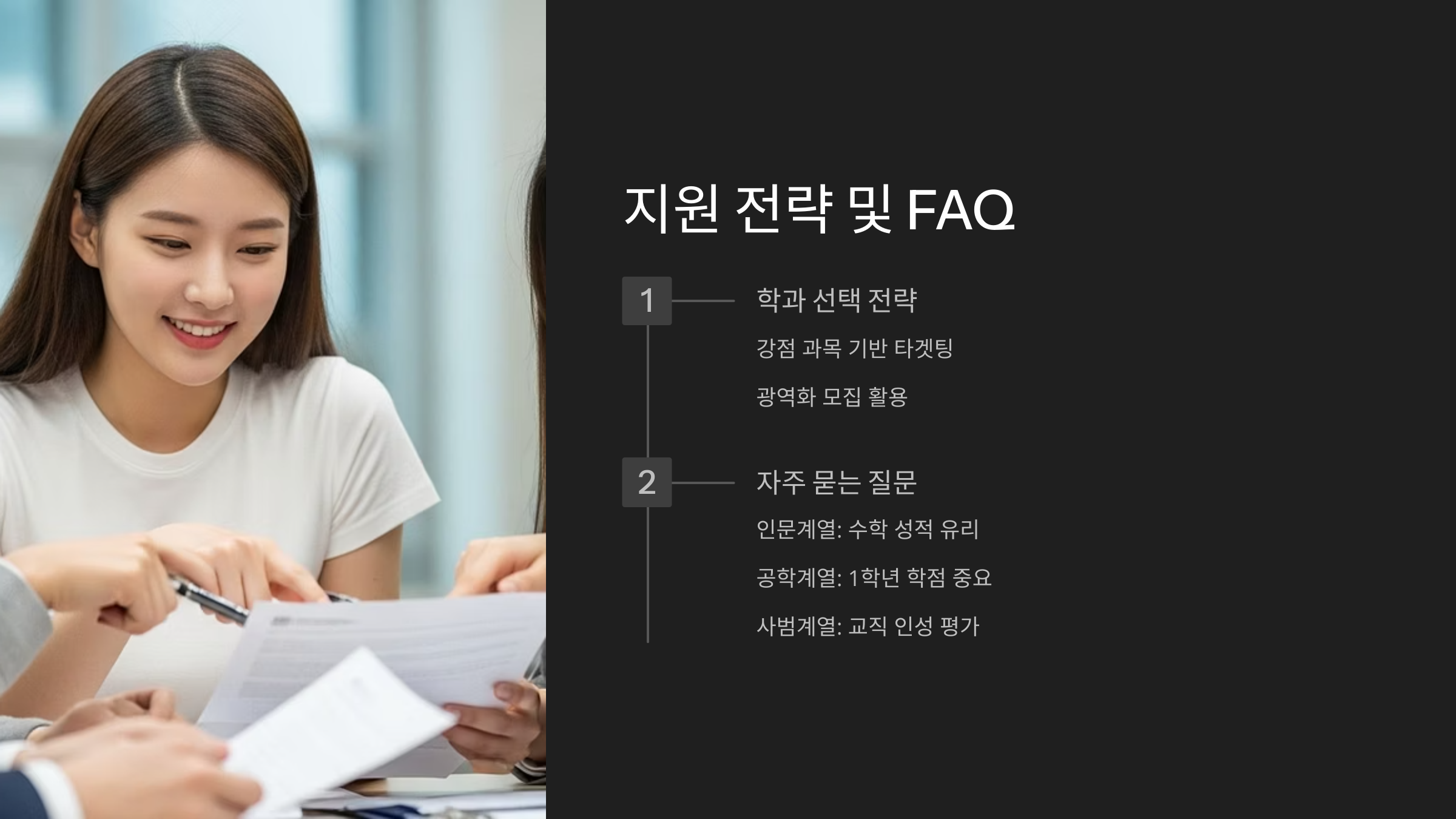 - 기준 강화 시: 수능에 자신 있는 학생이라면, 내신이 다소 불리하더라도 소신 지원을 고려해볼 수 있습니다. 실질 경쟁률 하락으로 인한 '펑크' 현상을 기대할 수 있습니다.