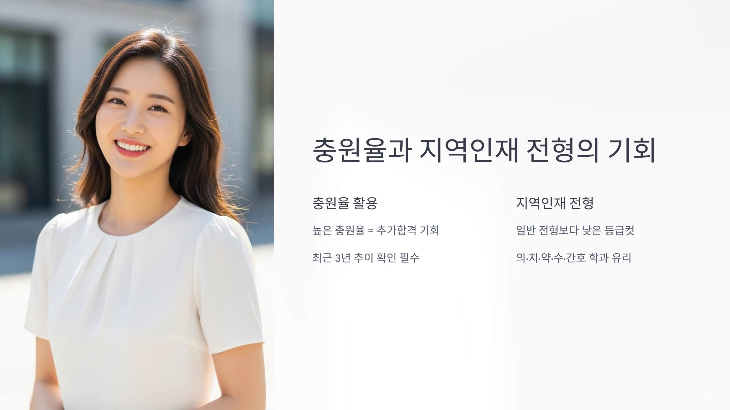 - 경쟁률 변수: 지역인재 전형의 모집인원이 적을 경우, 소수의 지원자 변수에 의해 등급컷이 예상과 다르게 움직일 수 있으므로 원서 접수 기간의 실시간 경쟁률을 반드시 참고해야 합니다.