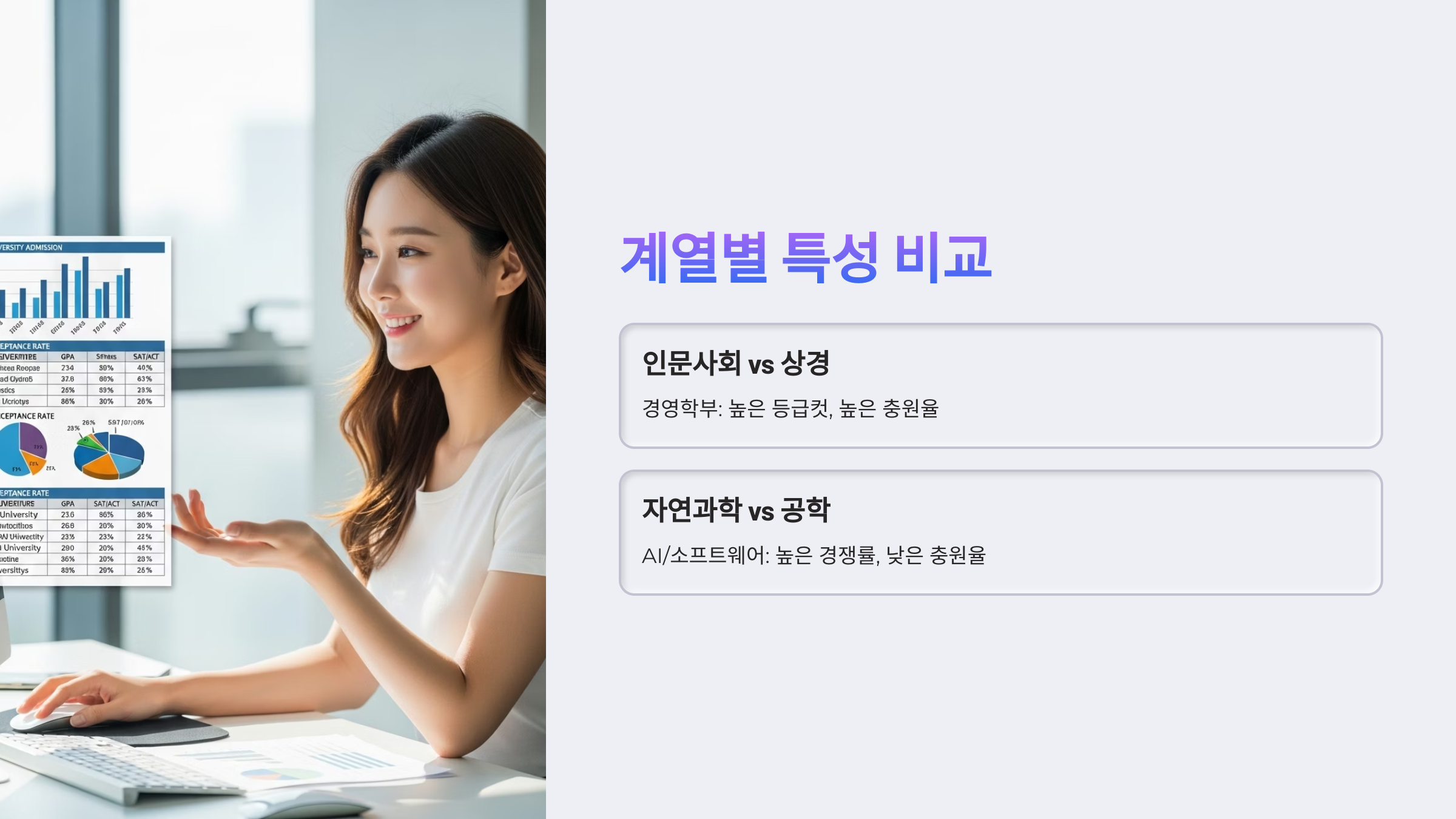 중앙대학교 수시모집에서 전통적으로 강세를 보이는 인문사회계열과 상경계열은 수험생들의 지원 패턴과 합격선에서 뚜렷한 차이를 보입니다. 미디어커뮤니케이션학부와 같은 인문사회계열의 간판 학과는 매우 높은 경쟁률과 함께 합격선 또한 최상위권에 형성됩니다. 하지만 주목할 점은 충원율입니다. 상경계열의 대표 학과인 경영학부는 높은 등급컷에도 불구하고 인문사회계열보다 월등히 높은 충원율을 기록하는 경향이 있습니다.
