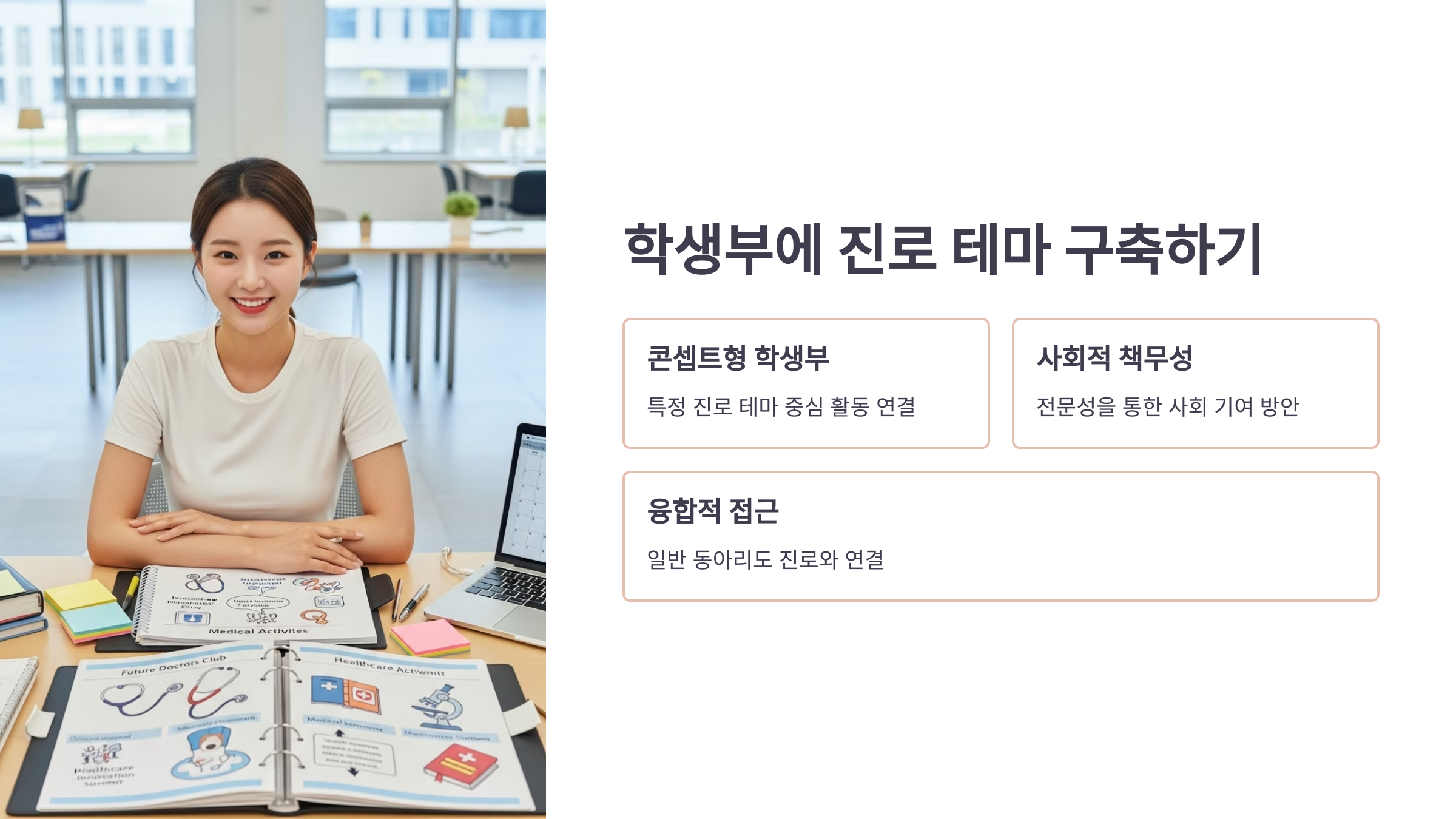 구체적인 진로 목표를 설정했다면, 다음 단계는 그 목표를 향한 노력을 학생부라는 결과물로 증명하는 것입니다. 최근 중앙대 의대 수시 합격생들의 학생부는 특정 '진로 테마'를 중심으로 모든 활동이 유기적으로 연결된 '콘셉트형 학생부'의 특징을 보입니다. 이는 입학사정관에게 지원자의 진정성과 꾸준함을 강력하게 어필하는 요소입니다.