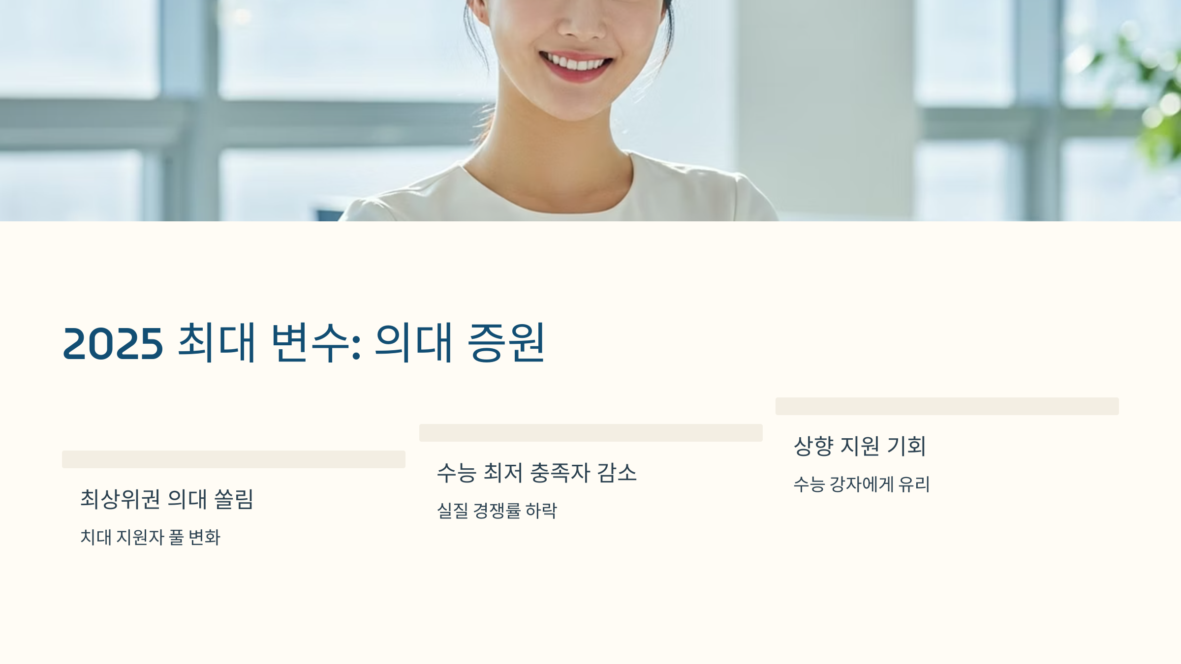 2025학년도 입시는 '의대 정원 확대'라는 전례 없는 변수를 안고 있습니다. 이는 치대 입시, 특히 수능 최저학력기준 충족률에 직접적인 연쇄 효과를 가져올 것입니다. 최상위권 수험생 중 상당수가 의대로 흡수되면서, 과거에 치대 수능 최저학력기준을 넉넉히 통과했을 법한 수험생 그룹이 대거 이탈할 가능성이 높습니다.