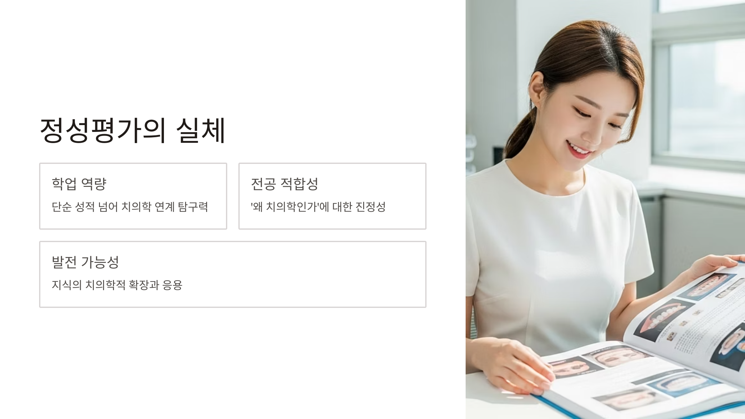학생부종합전형의 평가는 크게 학업 역량, 전공 적합성, 발전 가능성, 인성의 4가지 요소로 이루어집니다. 하지만 치대 입학사정관들은 이 요소들을 매우 까다롭고 심층적으로 들여다봅니다. 단순한 교과 성적을 넘어, 학생이 '미래의 치과의사'로서 필요한 자질과 탐구 역량을 갖추었는지를 학생부 곳곳에서 확인하고자 합니다.