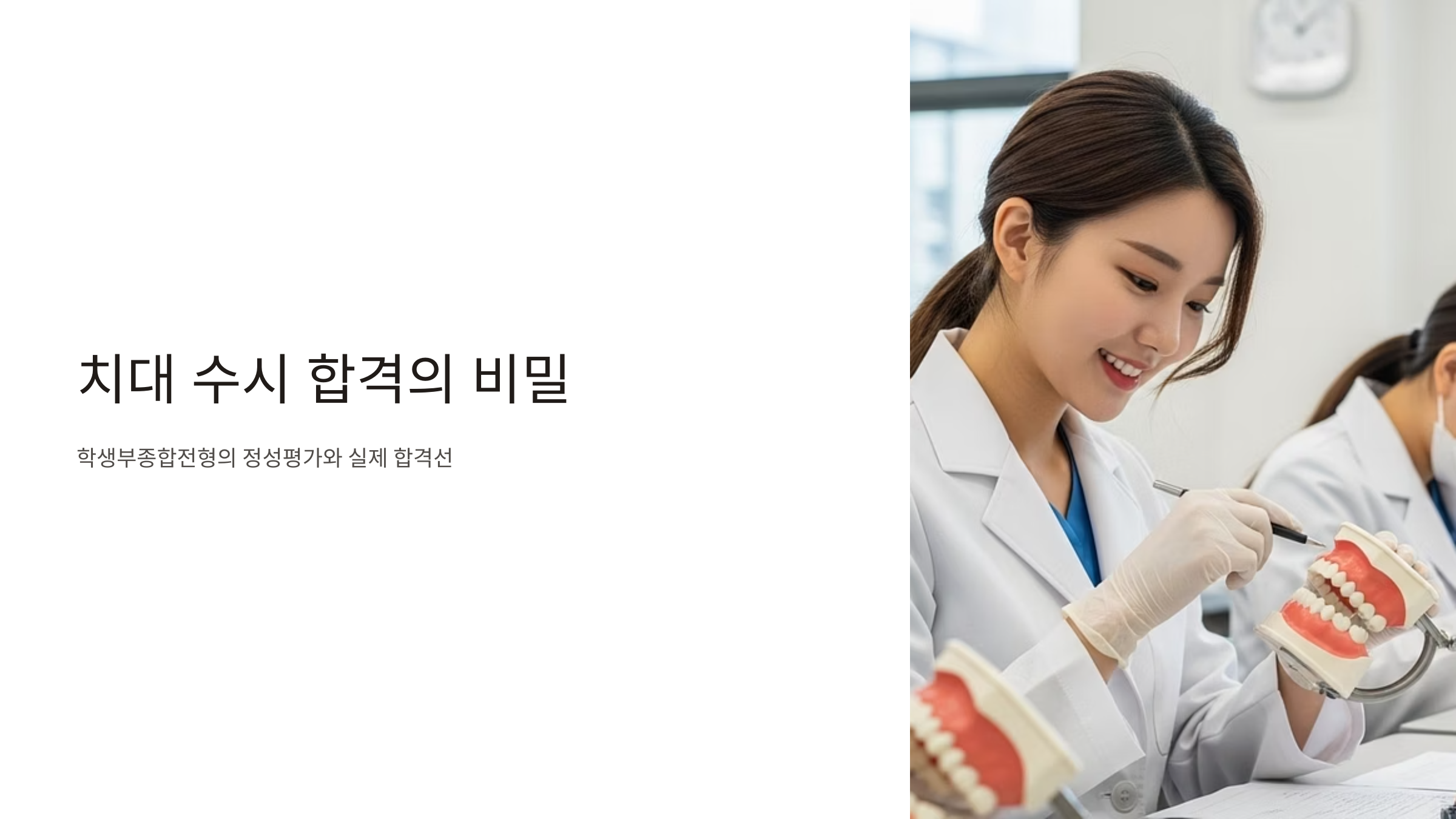 치대 수시 등급 대학별 합격컷 총정리: 학생부종합전형의 정성평가와 실제 합격선, 이 글은 단순히 숫자로 표현되는 내신 등급을 넘어, 학생부종합전형(학종) 합격의 본질인 '정성평가'를 심층적으로 분석합니다. 발표되는 합격선에 가려진 실제 합격 가능성을 가늠하고, 자신의 학생부를 어떻게 치의학적 역량과 연결하여 매력적인 스토리로 만들 수 있는지 구체적인 전략을 제시합니다.