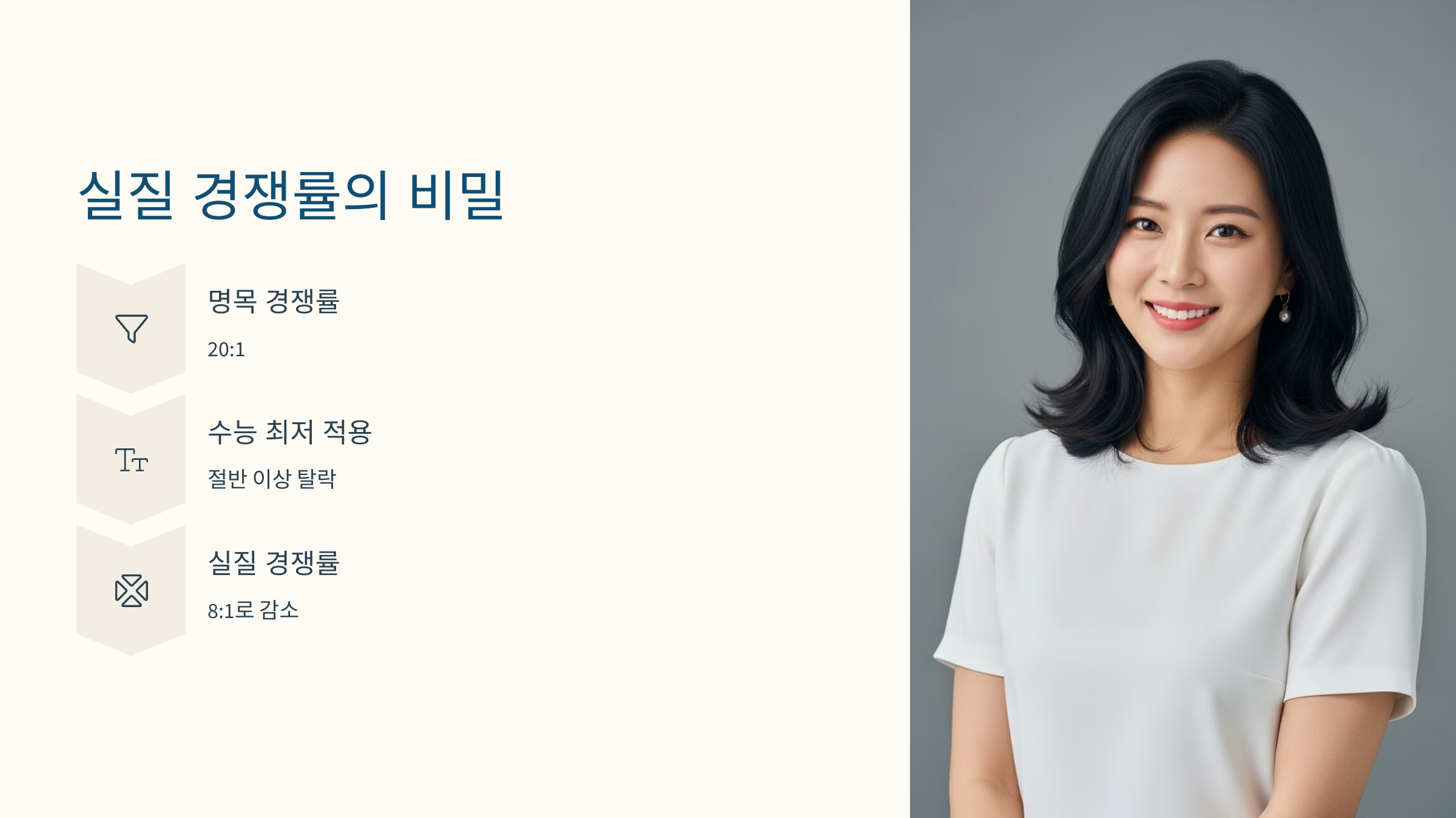 원서 접수 마감 후 발표되는 수십 대 일의 높은 경쟁률은 수험생들에게 엄청난 압박감을 줍니다. 하지만 이 숫자는 '허수'가 포함된 '명목 경쟁률'일 뿐입니다. 진짜 승부는 수능 성적 발표 후, 수능 최저학력기준을 충족한 학생들만을 대상으로 하는 '실질 경쟁률'에서 시작됩니다. 놀랍게도, 이 실질 경쟁률은 명목 경쟁률의 절반 이하, 심한 경우 3분의 1 수준까지 떨어지기도 합니다.