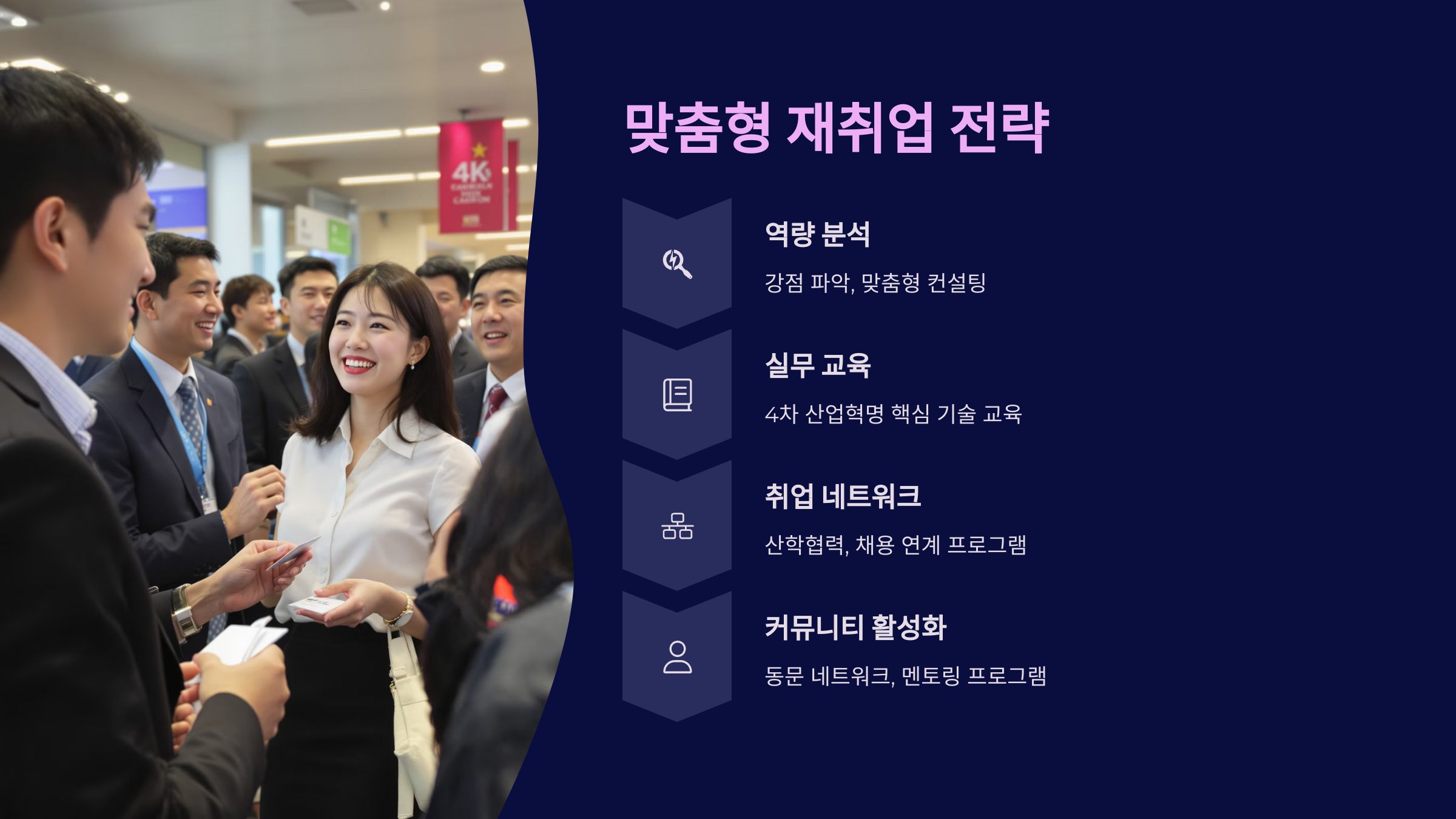 - 커뮤니티 활성화: 동문 네트워크를 구축하여 정보 교류 및 협력 기회를 제공하고, 재취업 성공 사례 공유, 멘토링 프로그램 등을 통해 지속적인 동기 부여 및 성장을 지원합니다.