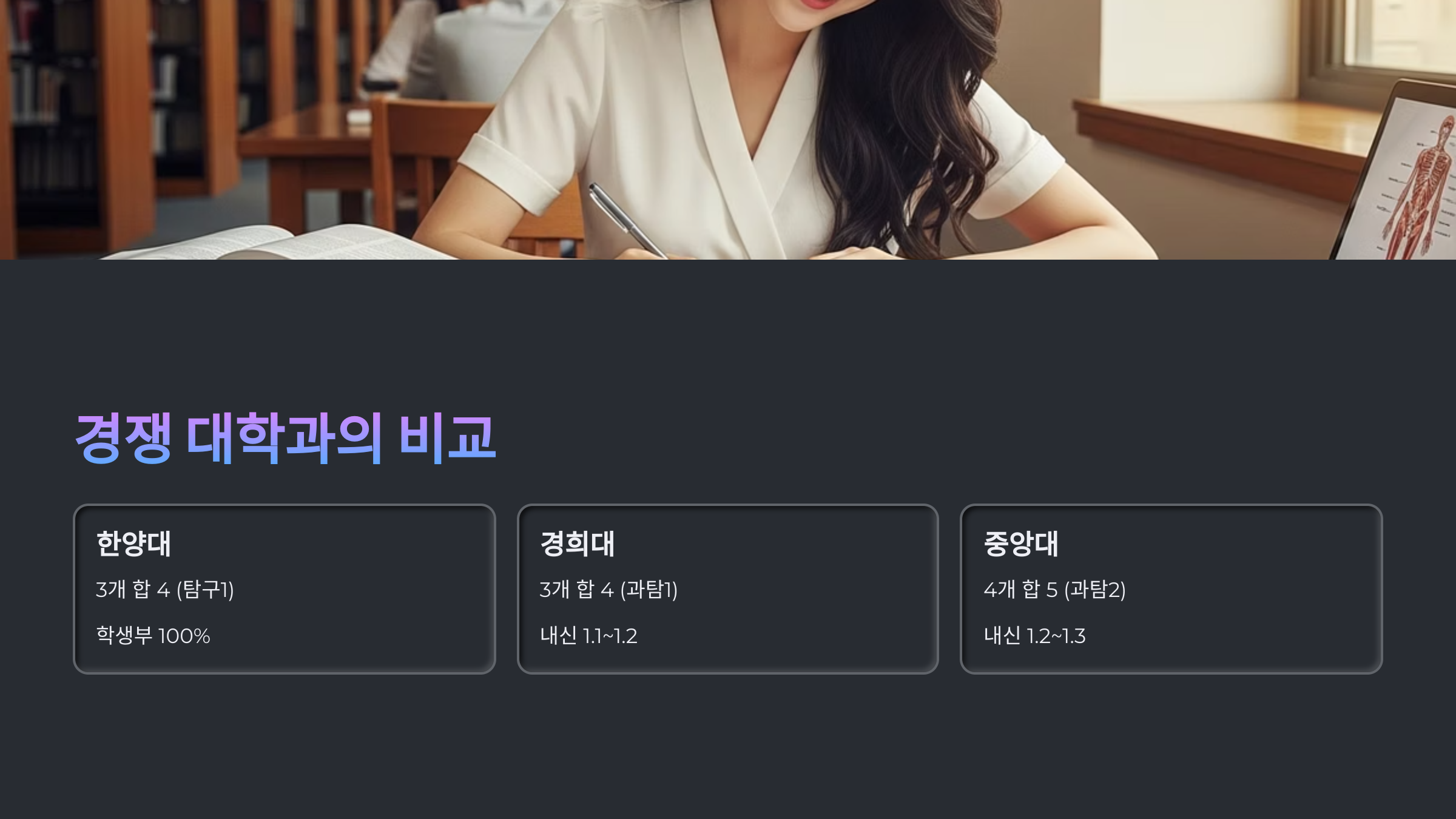 경쟁 대학과의 비교 분석을 통해 한양대 의대 수시 추천형의 합격선을 다음과 같이 구체적으로 예측해볼 수 있습니다. 경희대와 수능 최저 기준은 동일하지만, 한양대는 교과 성적을 정량 반영하지 않고 학생부 전체를 종합적으로 평가합니다. 이는 단순 내신 등급이 조금 낮더라도(예: 1.2~1.3) 의학 관련 탐구 역량이나 학업적 발전 가능성이 학생부에서 탁월하게 드러난다면 충분히 만회할 수 있음을 시사합니다.