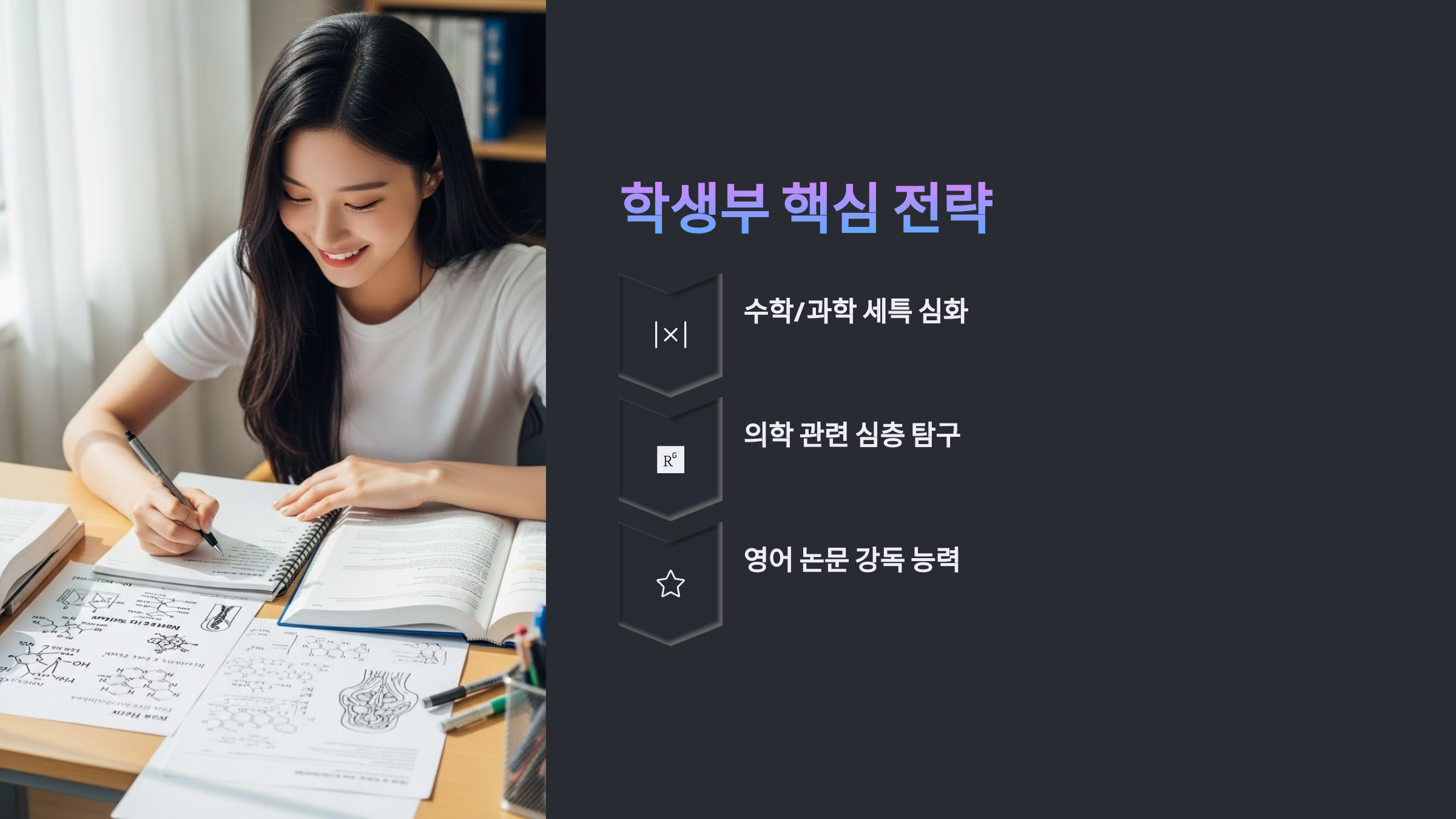 - 영어 원서 및 논문 강독 능력 어필: 의학 분야의 최신 지견은 대부분 영어로 발표됩니다. 교과 세특이나 자율 활동, 독서 활동 등에 전공 관련 영어 원서나 논문을 읽고 요약, 비판하는 활동을 포함시키면 학업 역량의 깊이를 보여줄 수 있습니다.
