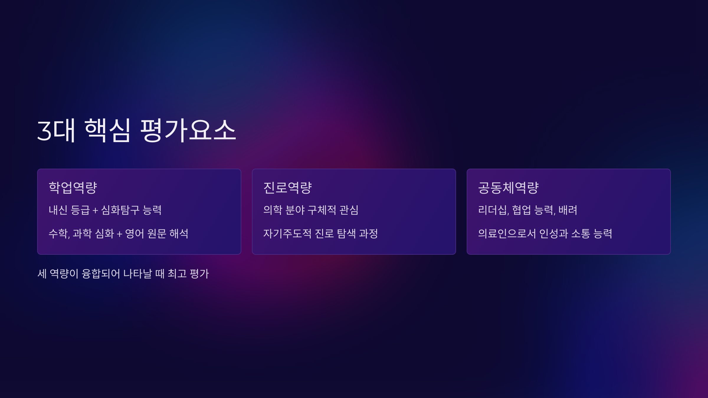 - 장기적 관점: 결국 의대 입시의 성공은 특정 과목의 유불리를 떠나 전 과목에 걸친 탄탄한 학업 능력에 기반하므로, 균형 잡힌 학습 습관이 가장 중요하다.