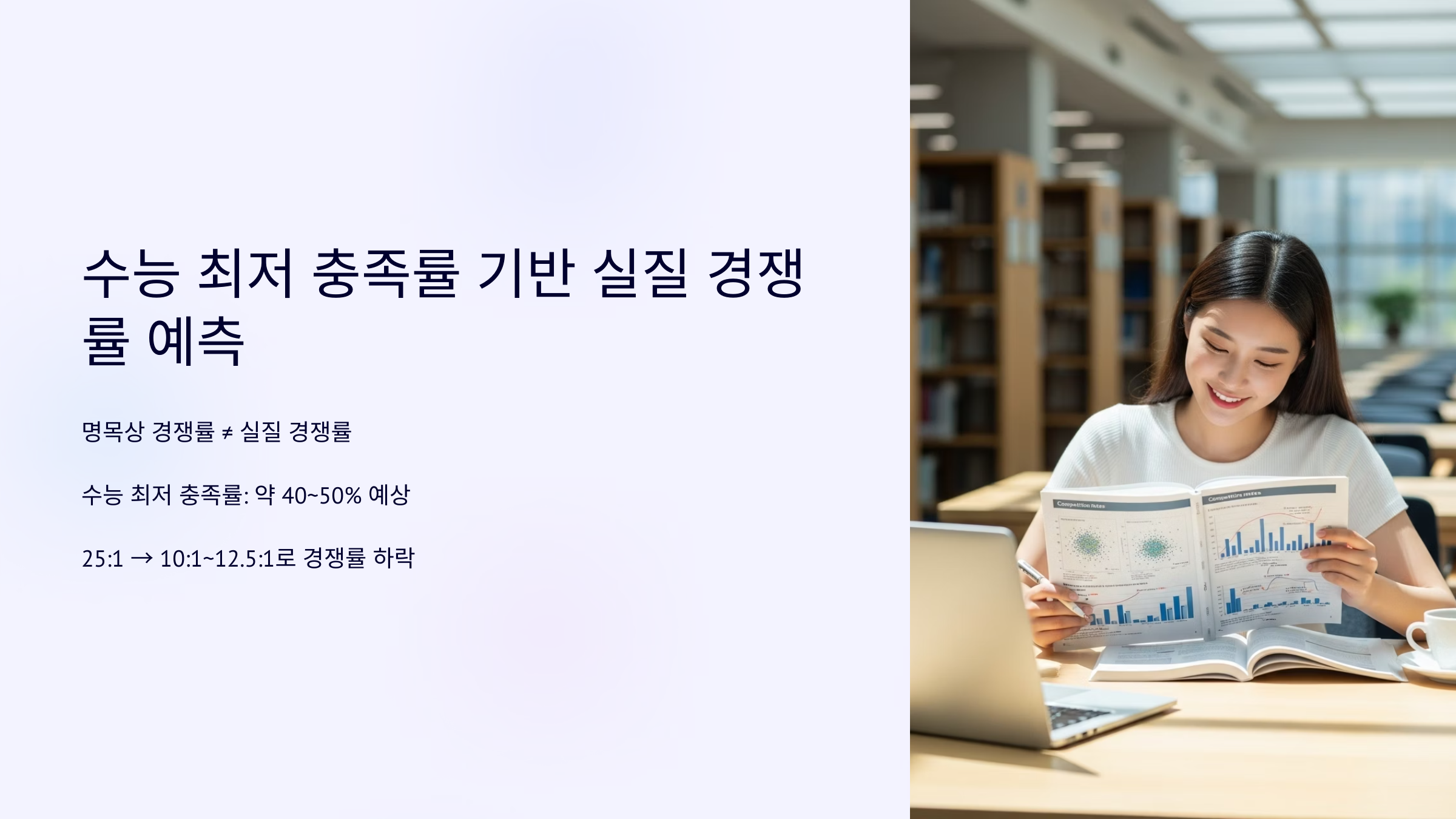 - 실질 경쟁률 하락: 명목상 경쟁률이 10:1 이더라도, 수능 최저 충족률을 30~40%로 가정하면 실질 경쟁률은 3:1 ~ 4:1 수준으로 급감하게 됩니다.