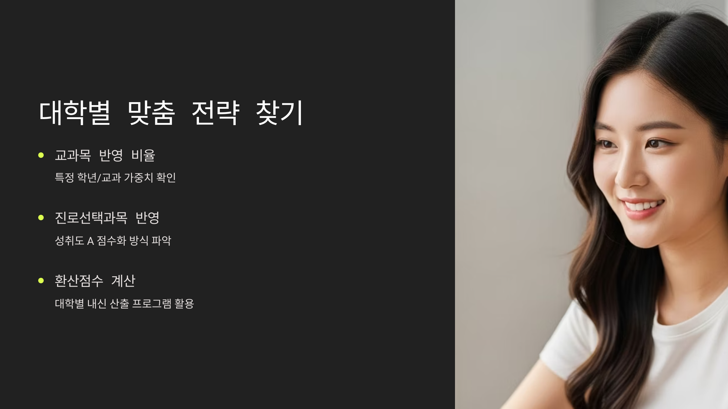- 진로선택과목 반영 방식: 진로선택과목의 성취도(A/B/C)를 어떻게 점수화하는지가 핵심입니다. 성취도 A에 높은 등급(1등급)을 부여하는 대학은, 관련 진로선택과목에서 A를 받은 학생에게 큰 이점이 됩니다.