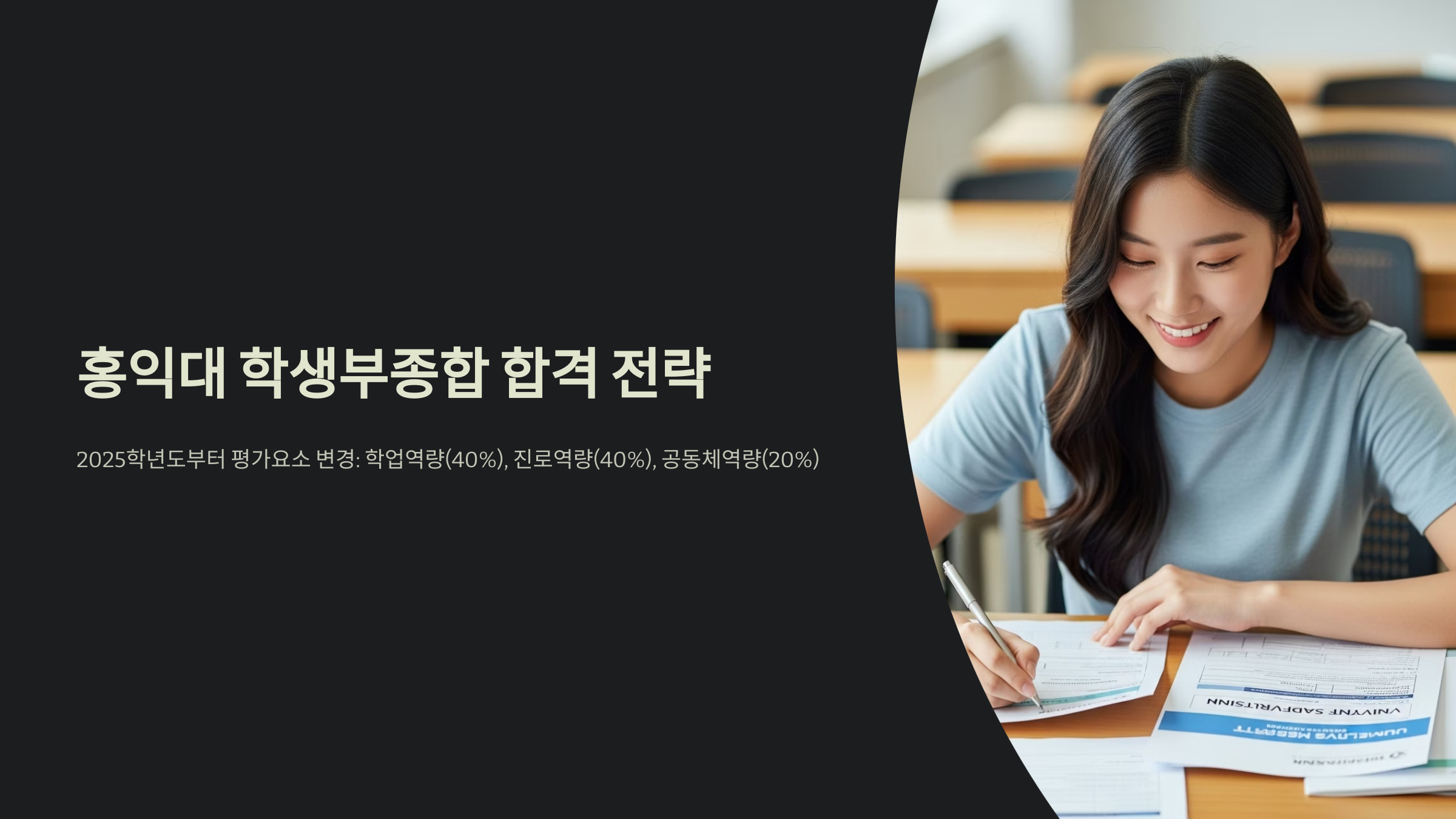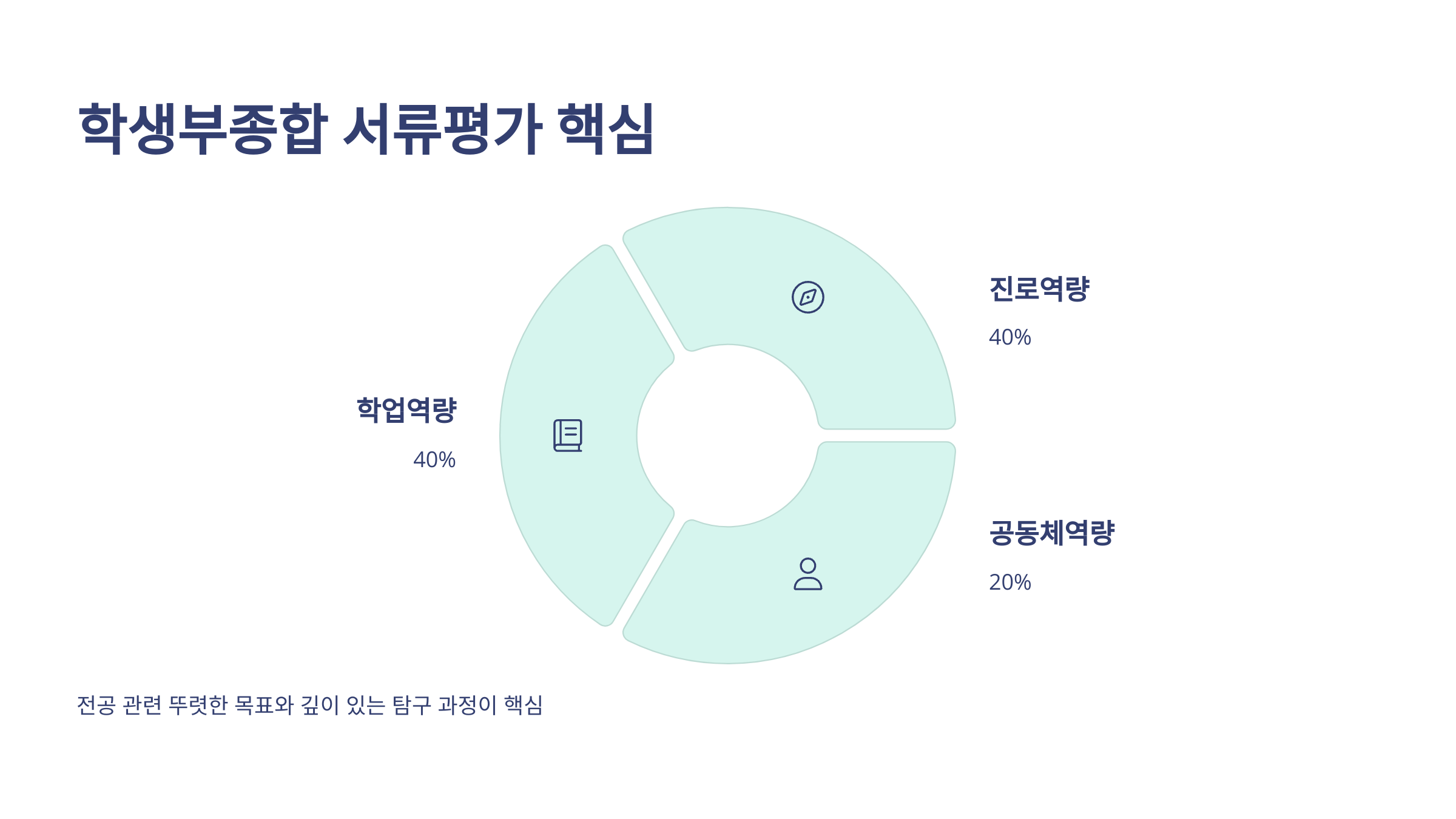 2025학년도부터 홍익대학교 학생부종합전형의 서류평가 요소는 학업역량(40%), 진로역량(40%), 공동체역량(20%)으로 변경되었습니다. 각 항목의 비율은 합격에 있어 무엇을 더 중요하게 보는지를 명확히 보여줍니다. 높은 홍익대 수시 등급컷을 뚫기 위해서는 이 세 가지 요소를 전략적으로 관리해야 합니다.