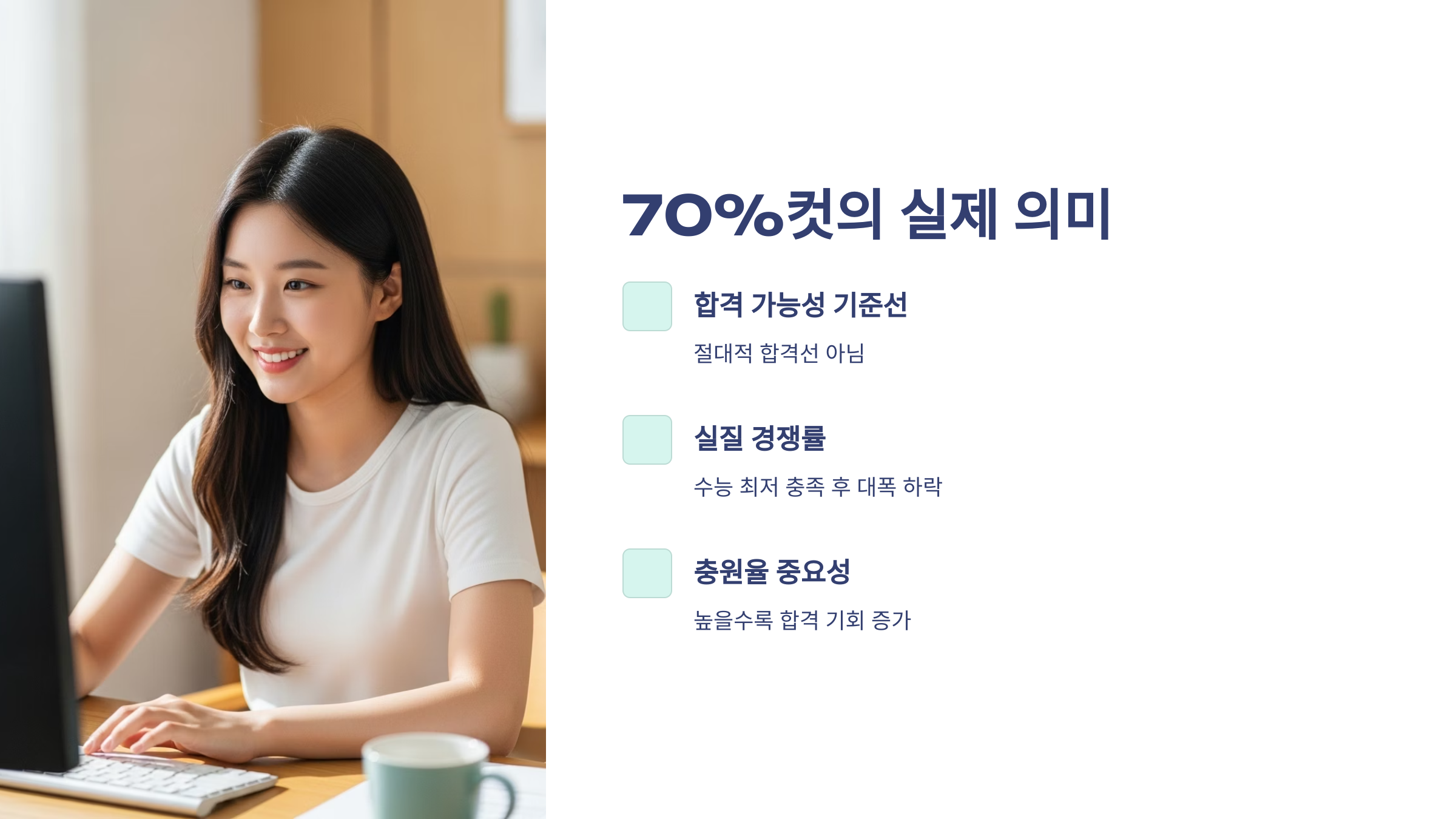 - 학생부종합전형에서의 의미: 서류를 정성평가하는 학생부종합전형에서는 70%컷의 의미가 상대적으로 퇴색됩니다. 교과 성적이 다소 낮더라도 서류 경쟁력이 우수하면 충분히 합격할 수 있기 때문입니다.